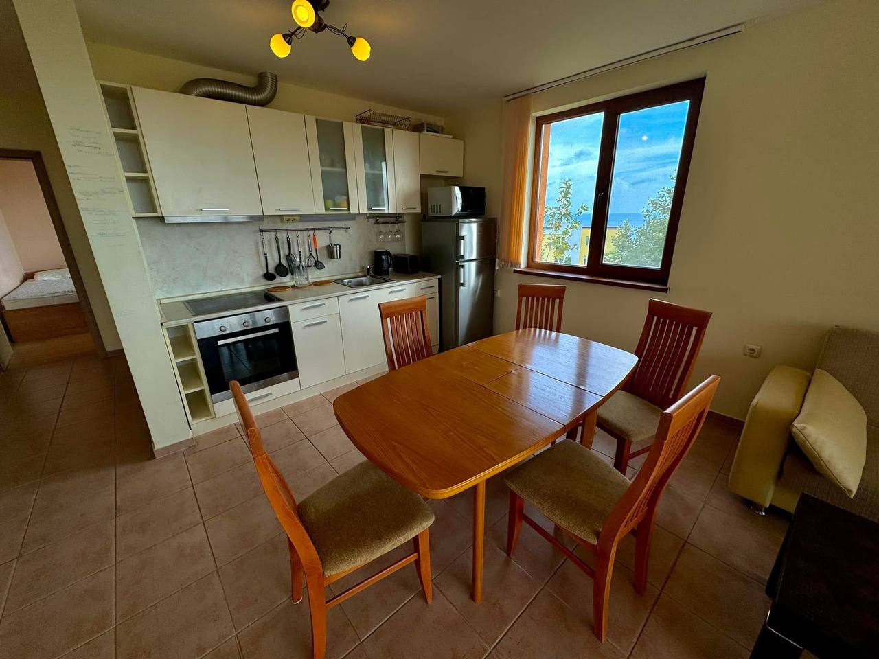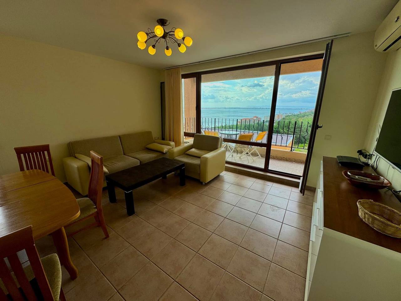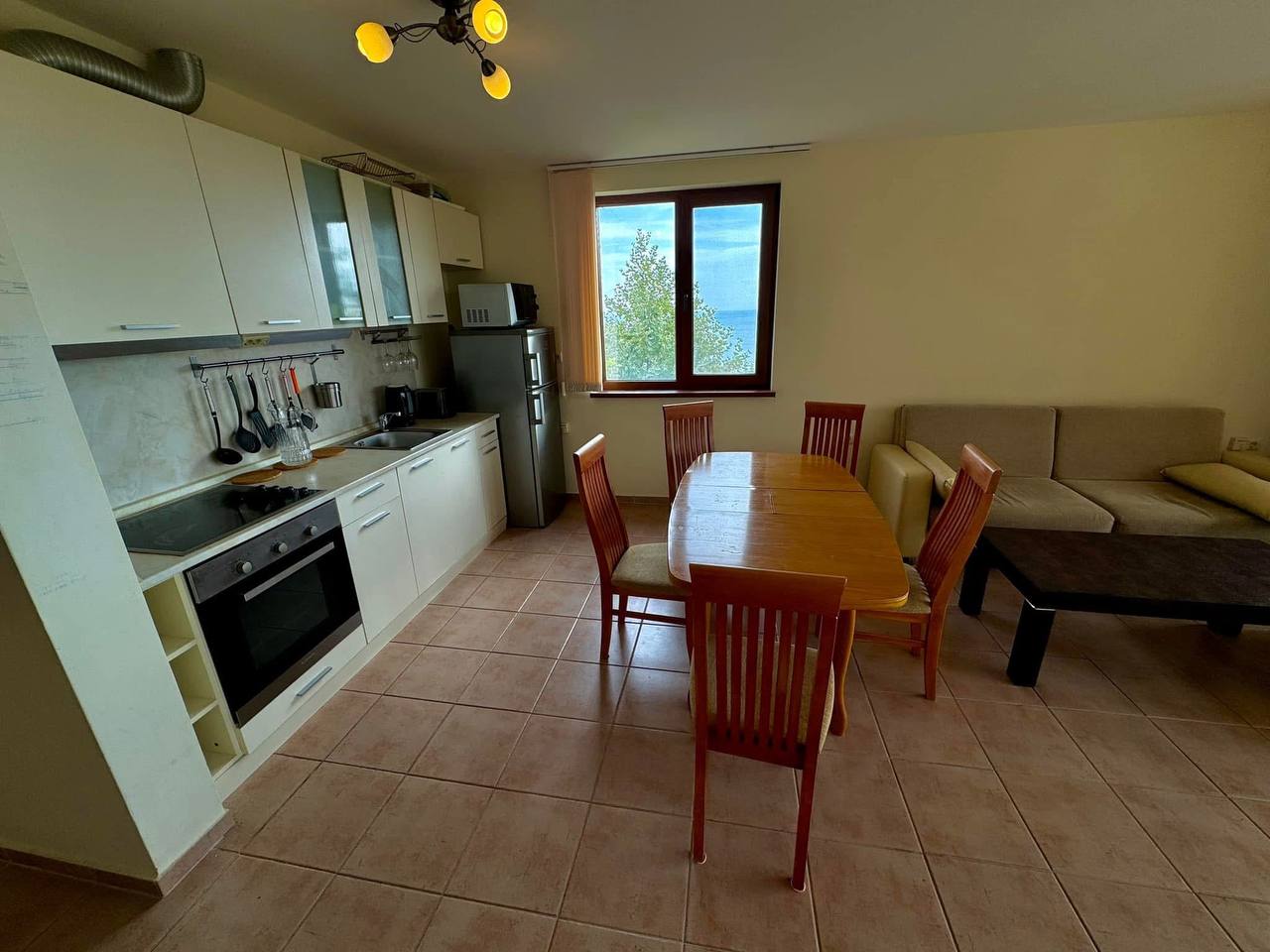 Апартамент отличается продуманной планировкой и большими панорамными окнами, которые наполняют пространство светом и создают ощущение уюта и свободы. Просторная гостиная объединена с кухонной зоной и столовой, что делает её идеальной для семейных ужинов и приёма гостей. Две изолированные спальни обеспечивают комфорт и приватность, а терраса с видом на море или внутренний двор позволяет наслаждаться атмосферой побережья в любое время дня.