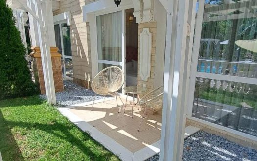 Квартира на партерном этаже, общая площадь 43 м². Включает просторную гостиную с кухонной зоной, отдельную спальню, коридор и санузел. Уютный дворик с выходом к бассейну создаёт атмосферу проживания в доме с садом, что удобно для отдыха и аренды.