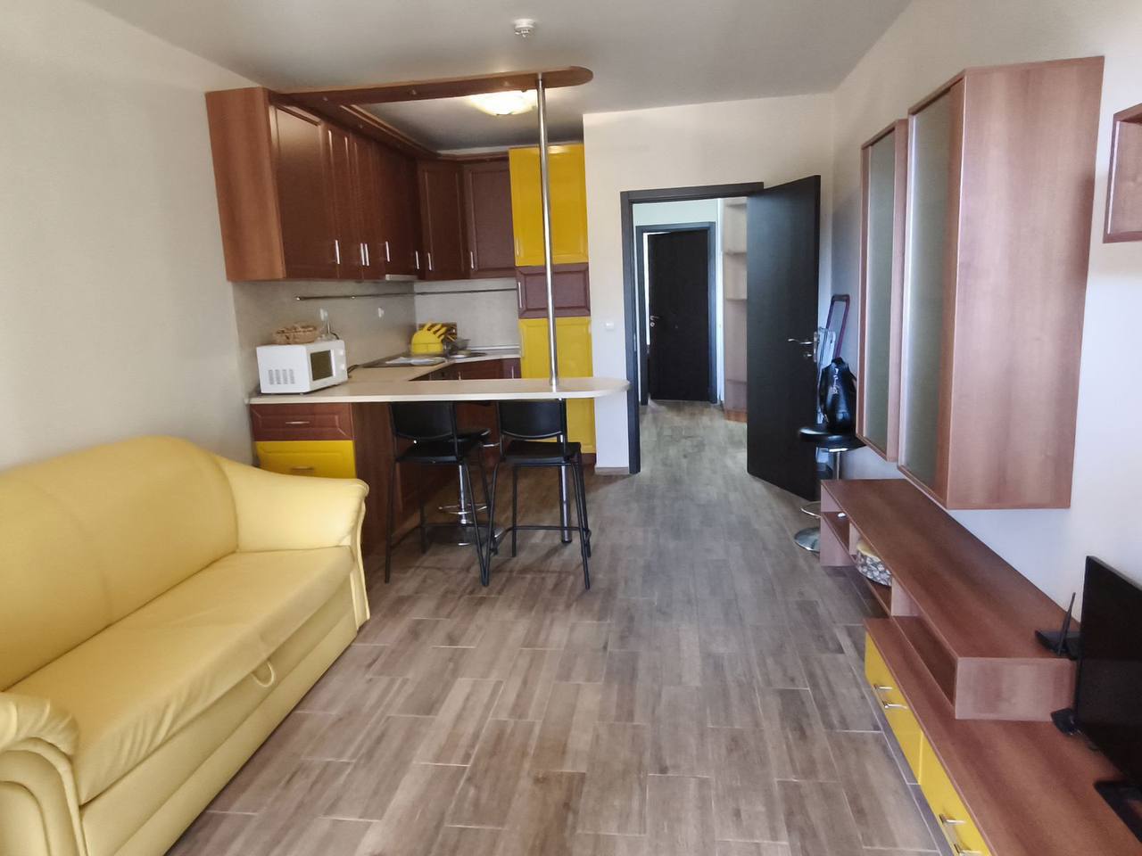 Квартира на первом этаже площадью 60 м² с классической планировкой «распашонка». Окна выходят на две стороны, обеспечивая отличную вентиляцию и естественное освещение. В квартире есть гостиная с кухонной зоной и отдельная спальня, что делает её удобной для жизни и аренды.