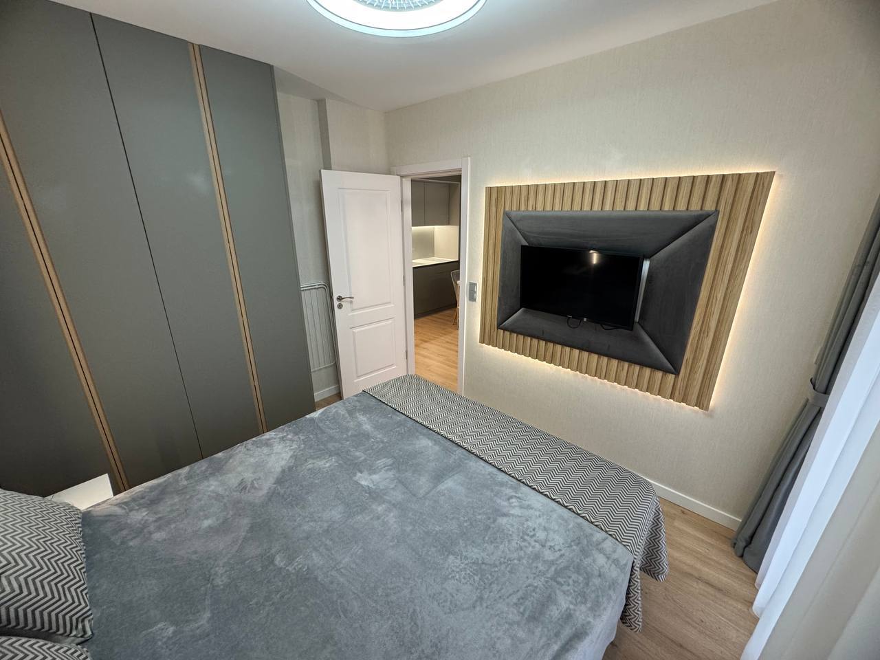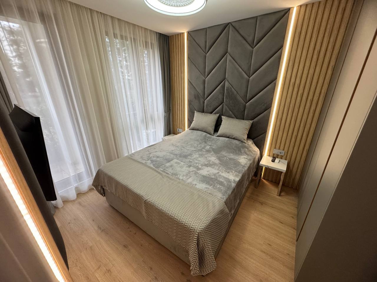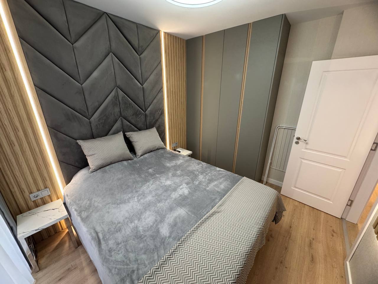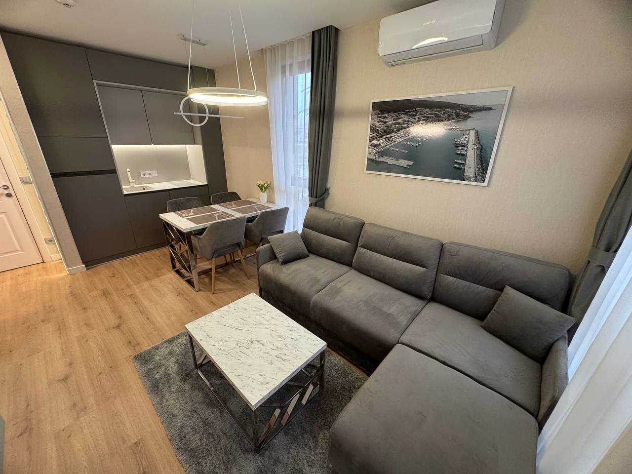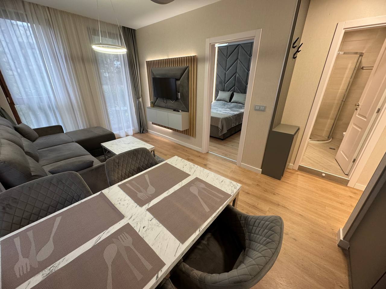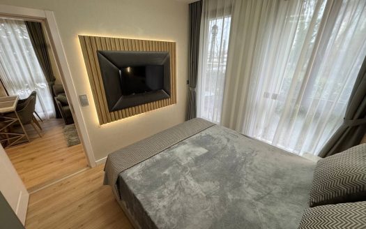 Квартира на первом этаже, площадью 45 м², включает гостиную с кухонной зоной и отдельную спальню. Рациональная планировка делает ее удобной для проживания пары или использования в качестве сезонного жилья. Первый этаж обеспечивает быстрый доступ к территории комплекса.