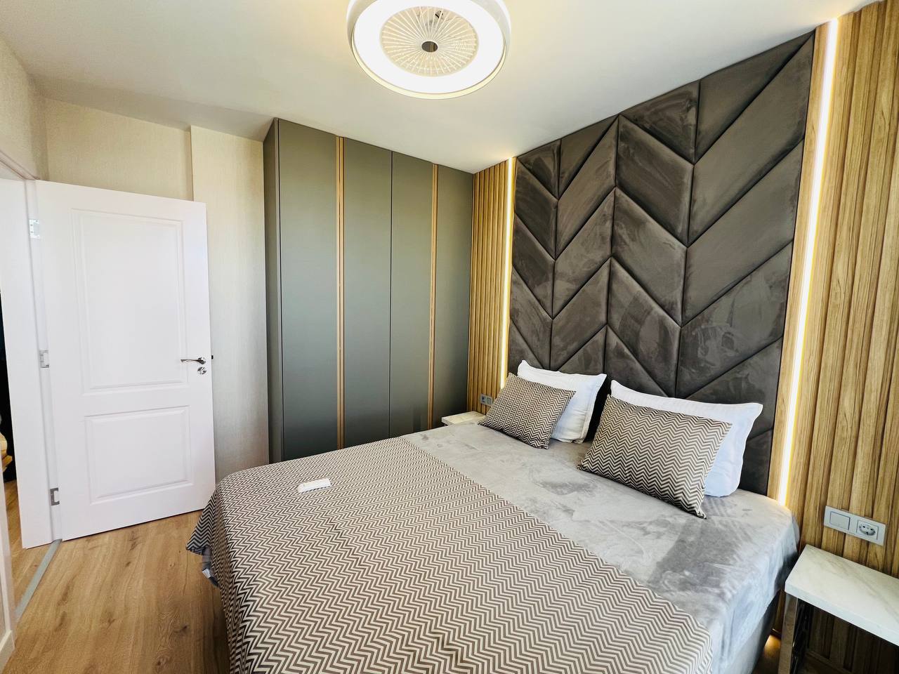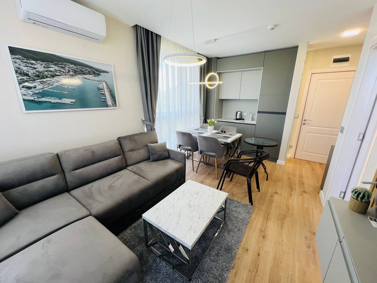 Квартира площадью 45 м² находится на шестом этаже. Планировка включает гостиную с кухонной зоной и отдельную спальню. Пространство организовано рационально: в гостиной удобно разместится мягкая зона, а изолированная спальня обеспечивает комфорт для пары или небольшой семьи.