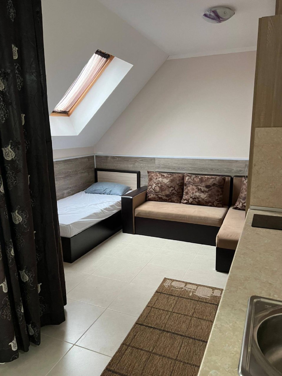 Квартира на пятом этаже пятиэтажного здания обеспечивает приватность и тишину. Общая площадь составляет 42 квадратных метра. Планировка включает прихожую, гостиную с кухонной зоной, отдельную спальню и санузел, что делает её идеальной для одного человека или пары.
