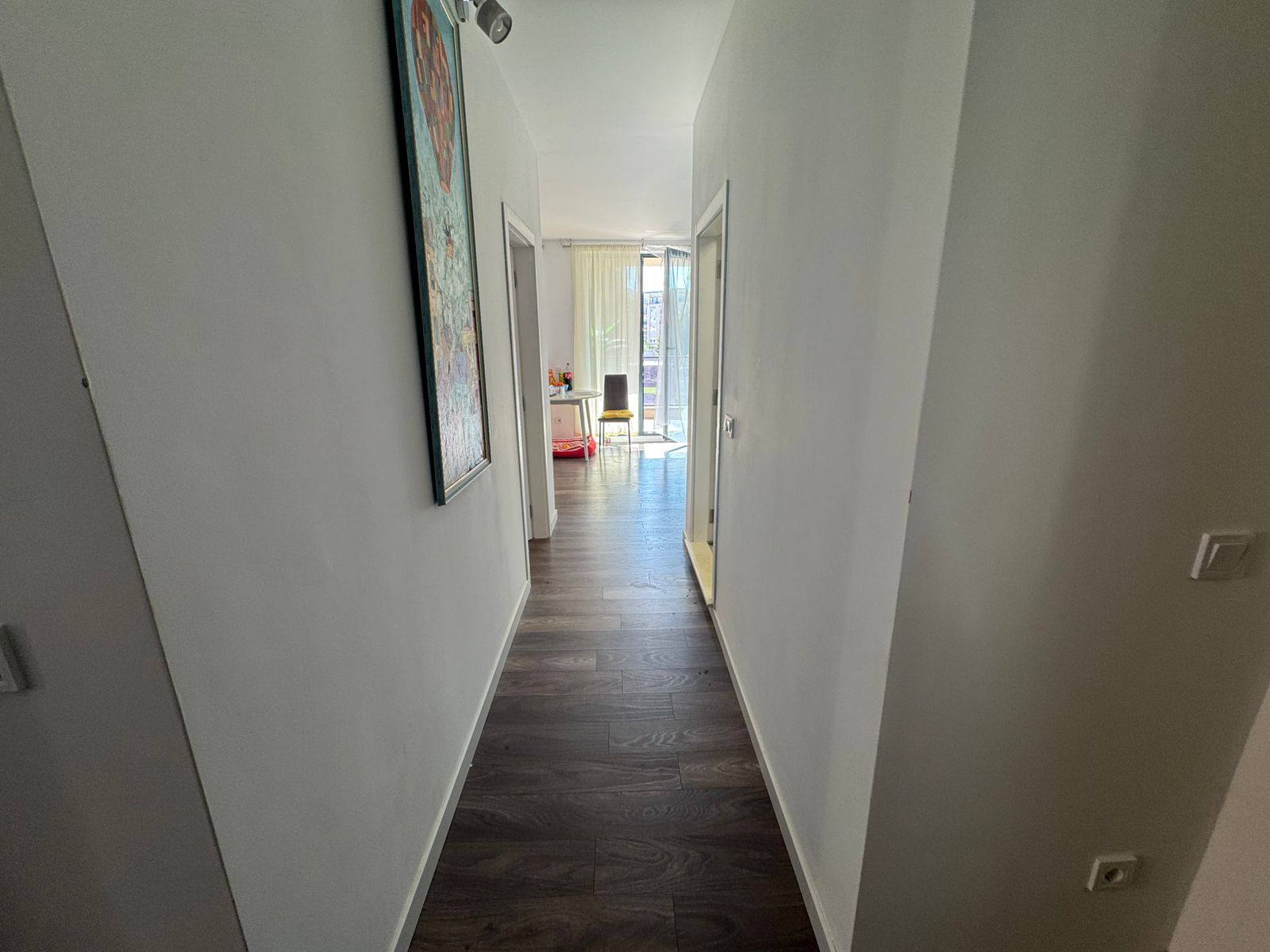 Квартира находится на втором этаже нового корпуса комплекса, введённого в эксплуатацию в 2025 году. Общая площадь составляет 96 квадратных метров. В планировку входит просторная гостиная с кухонной зоной и три отдельные спальни, что обеспечивает комфортное проживание для семьи или группы арендаторов. В квартире предусмотрены два санузла, коридор и две террасы, что создаёт удобное разделение личных и общих зон. Южная ориентация обеспечивает хорошее естественное освещение и тепло в течение всего дня.