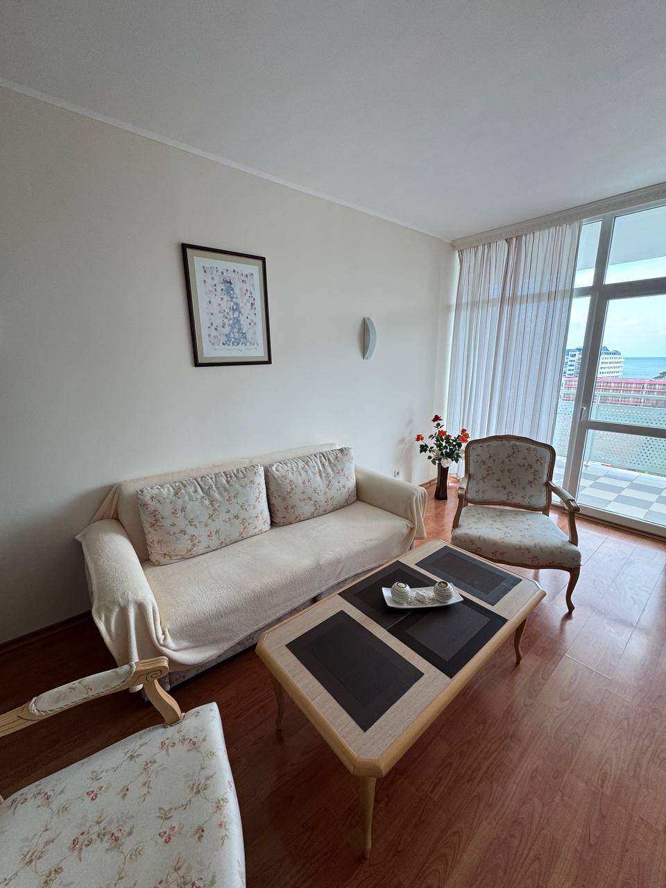 Квартира находится на восьмом этаже, что обеспечивает прекрасный вид на море и окружающие пейзажи. Общая площадь составляет 98 квадратных метров, что значительно превышает стандартные размеры квартир. Планировка включает просторную гостиную с кухонной зоной, отдельную спальню, коридор, санузел и террасу с видом на море. Высокий этаж и большая площадь создают ощущение простора и света, что делает квартиру удобной как для постоянного проживания, так и для отдыха.