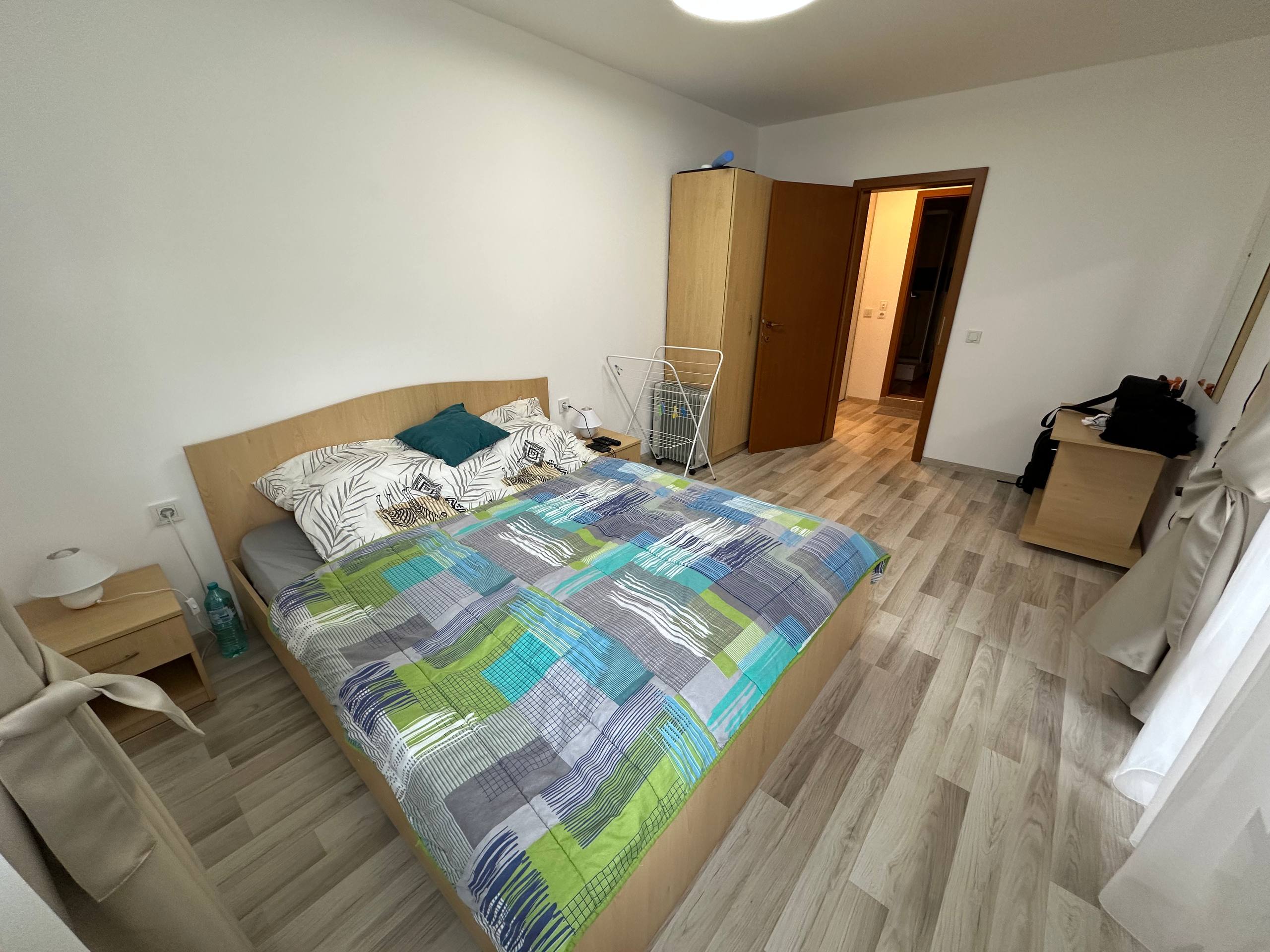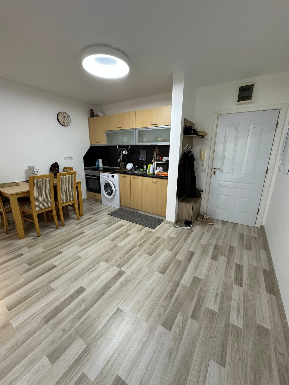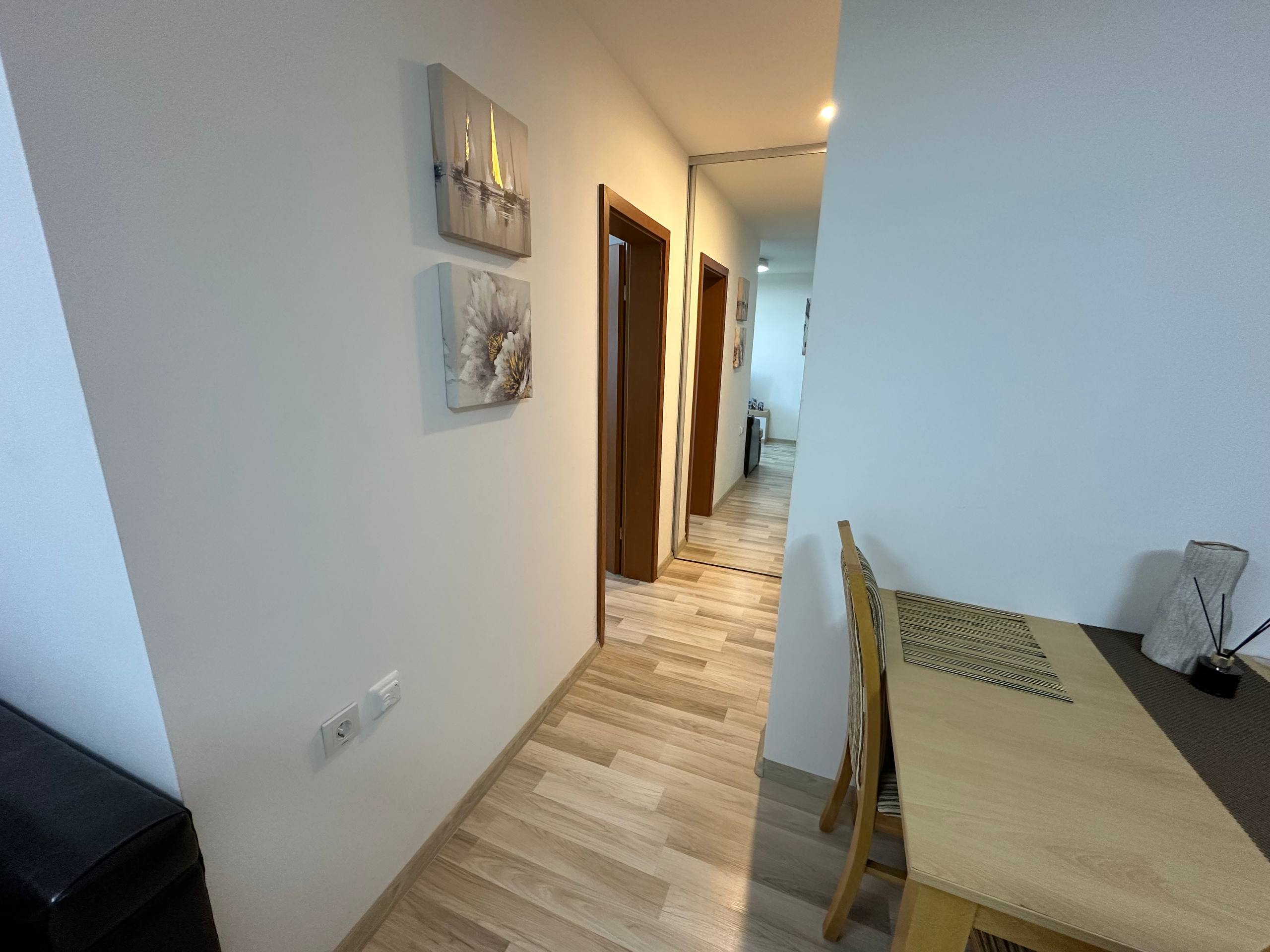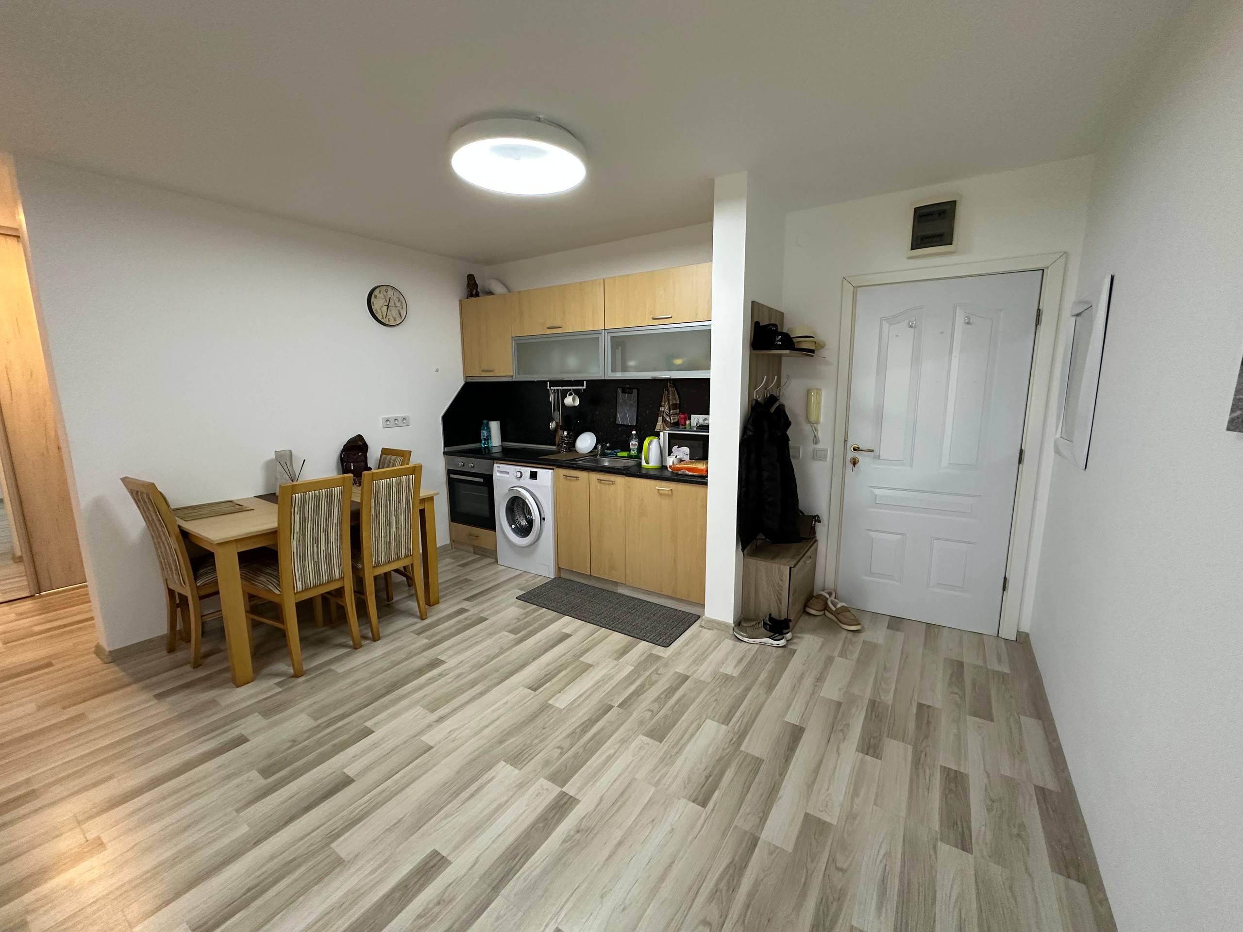 Квартира расположена на первом этаже и имеет общую площадь 65 квадратных метров. Планировка включает просторную гостиную с кухонной зоной, отдельную спальню, ванную комнату и террасу. Это жилье подходит как для жизни, так и для аренды, обеспечивая функциональность и комфорт.
