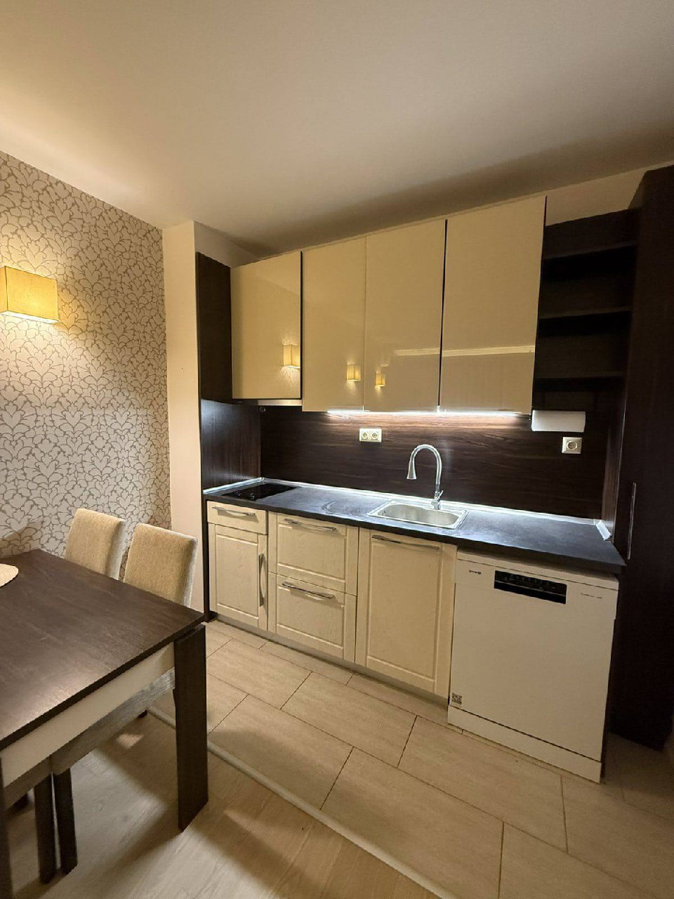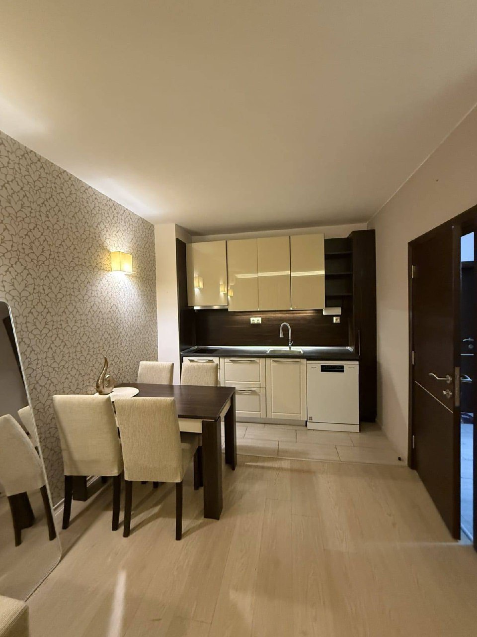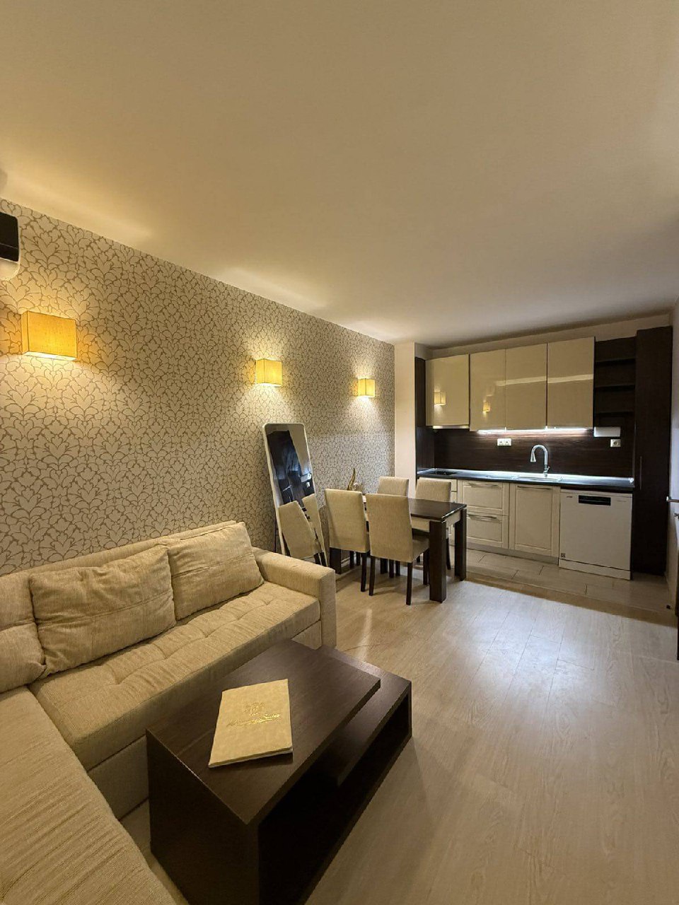 Квартира площадью 63 квадратных метра находится на втором этаже. Планировка включает кухню-гостиную и отдельную спальню, что делает её полноценной двухкомнатной квартирой. Окна выходят на бассейн, создавая приятную атмосферу. Квартира полностью меблирована и оснащена техникой, включая духовой шкаф и посудомоечную машину.