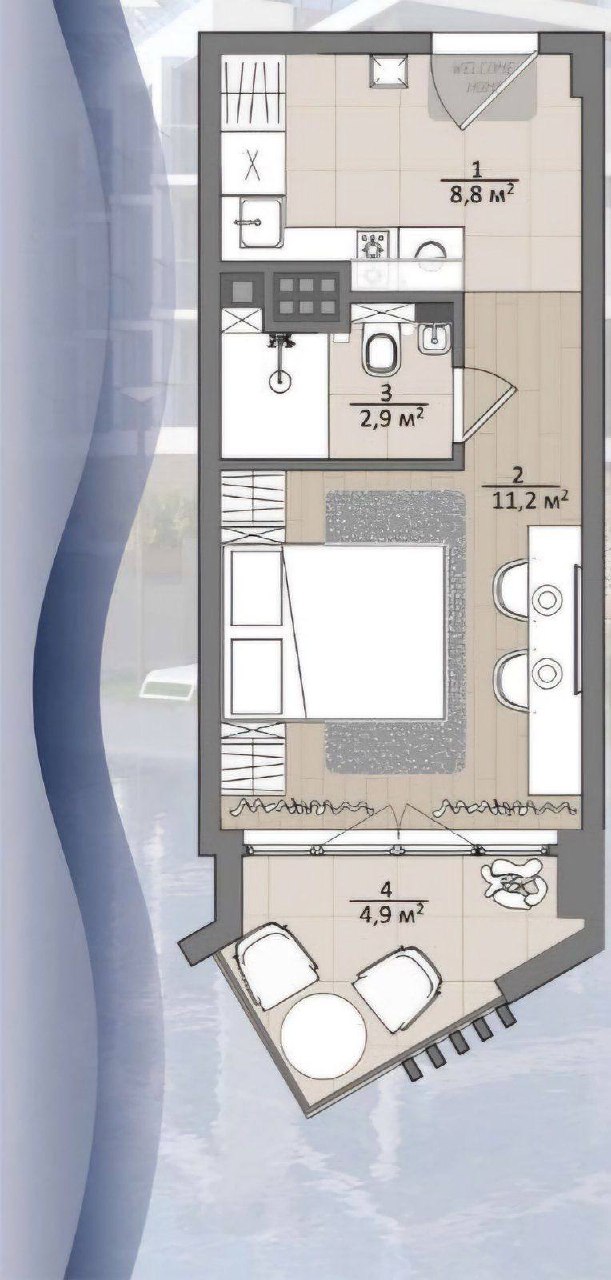 Планировка представляет собой единое жилое пространство, которое при необходимости можно зонировать на кухонную и спальную части. Панорамный вид на море открывается из квартиры и является ключевой особенностью данного объекта. Этажность обеспечивает баланс между удобством доступа и хорошей обзорностью.