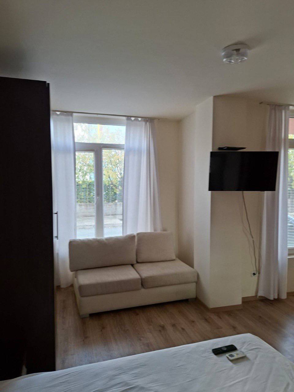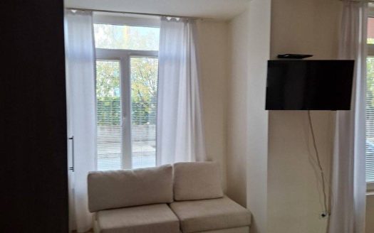 The apartment is located on the second floor of the building, with the actual level being about one and a half meters off the ground, making it easy to access and comfortable to live in. The total area of the studio is 28 square meters. The format is classic and practical: a single living space allows you to organize a recreation area, sleeping place and kitchen part without feeling cramped. This size is well suited for a single person, a couple or for short-term rentals in high season.