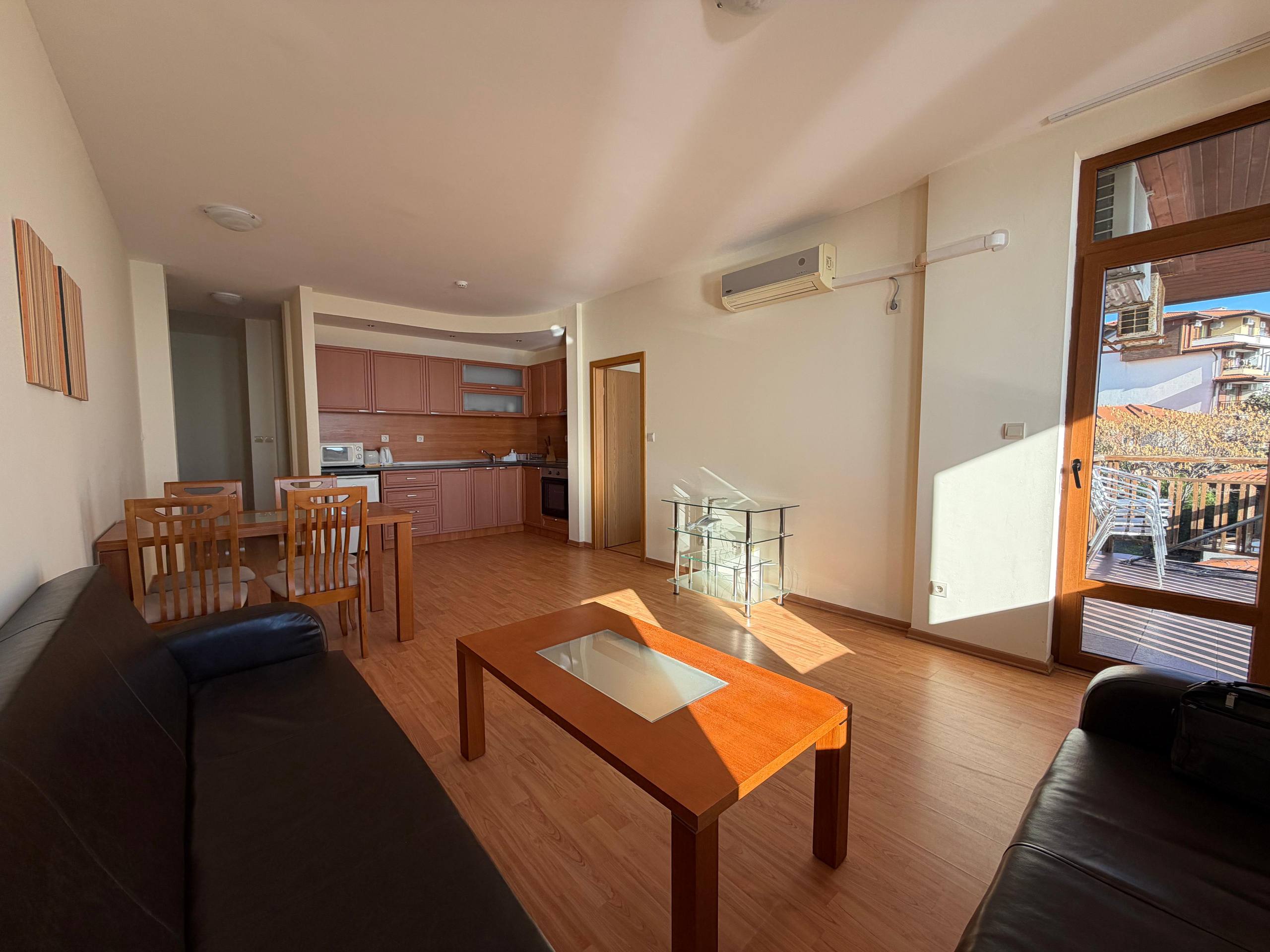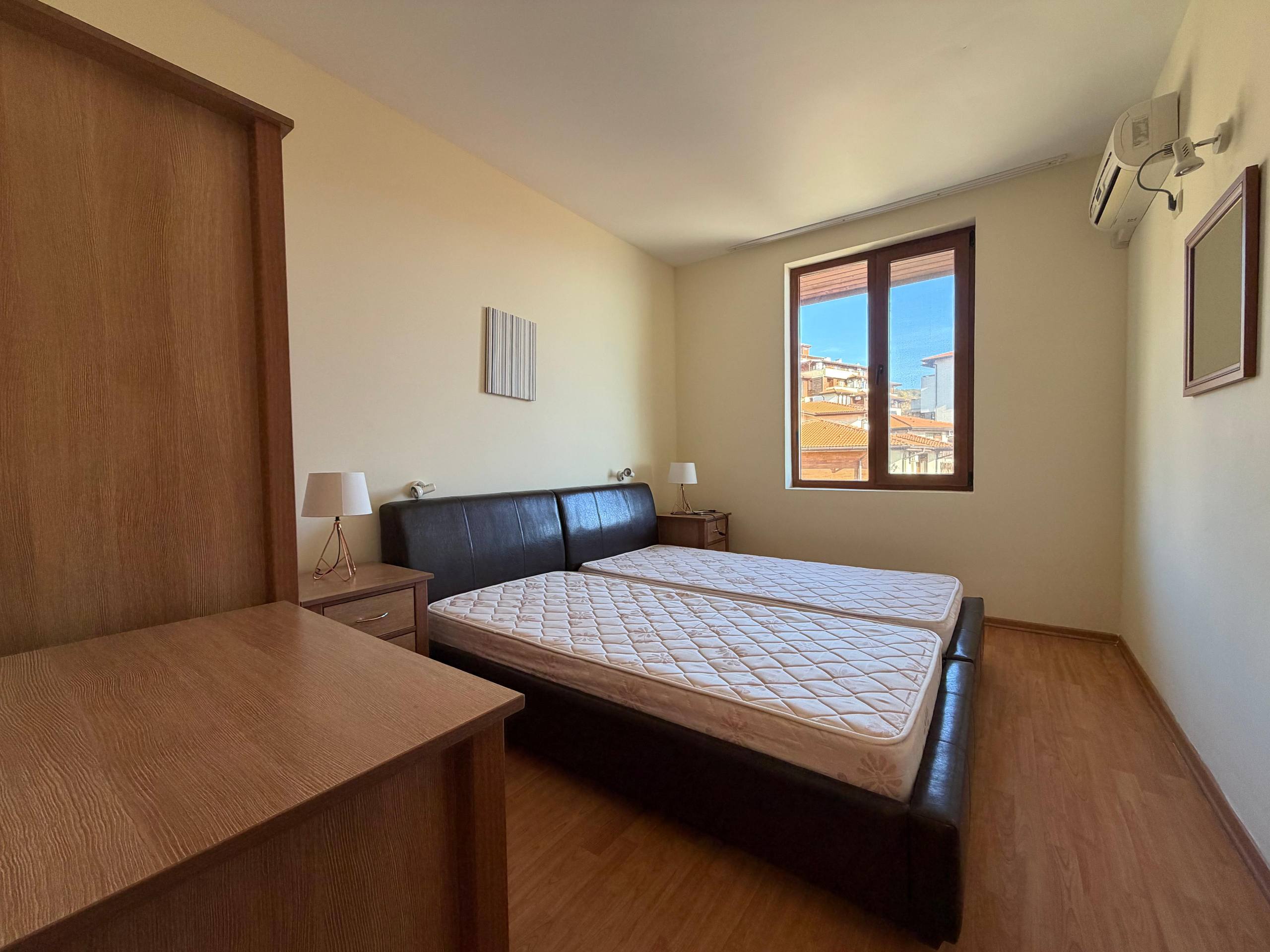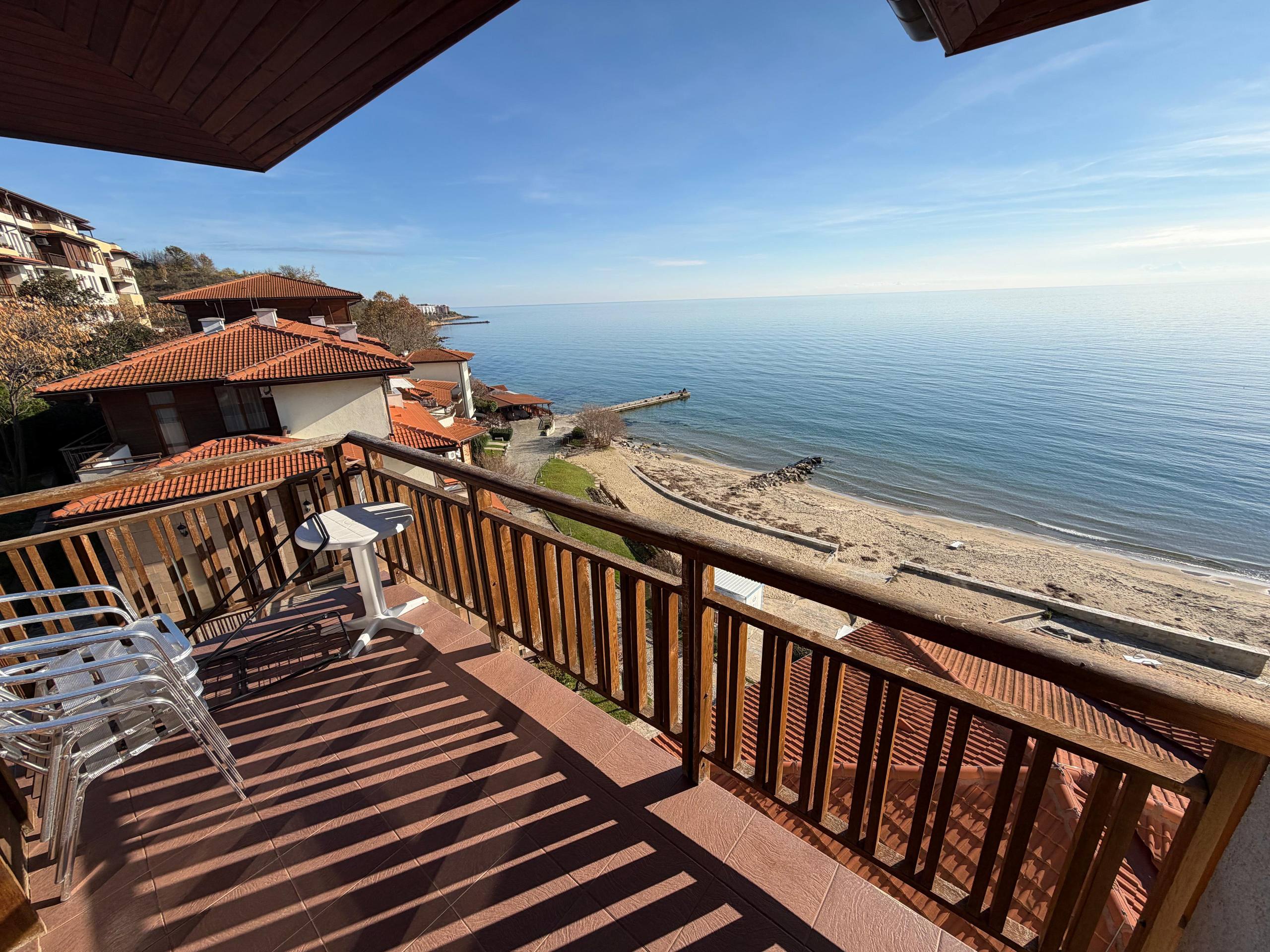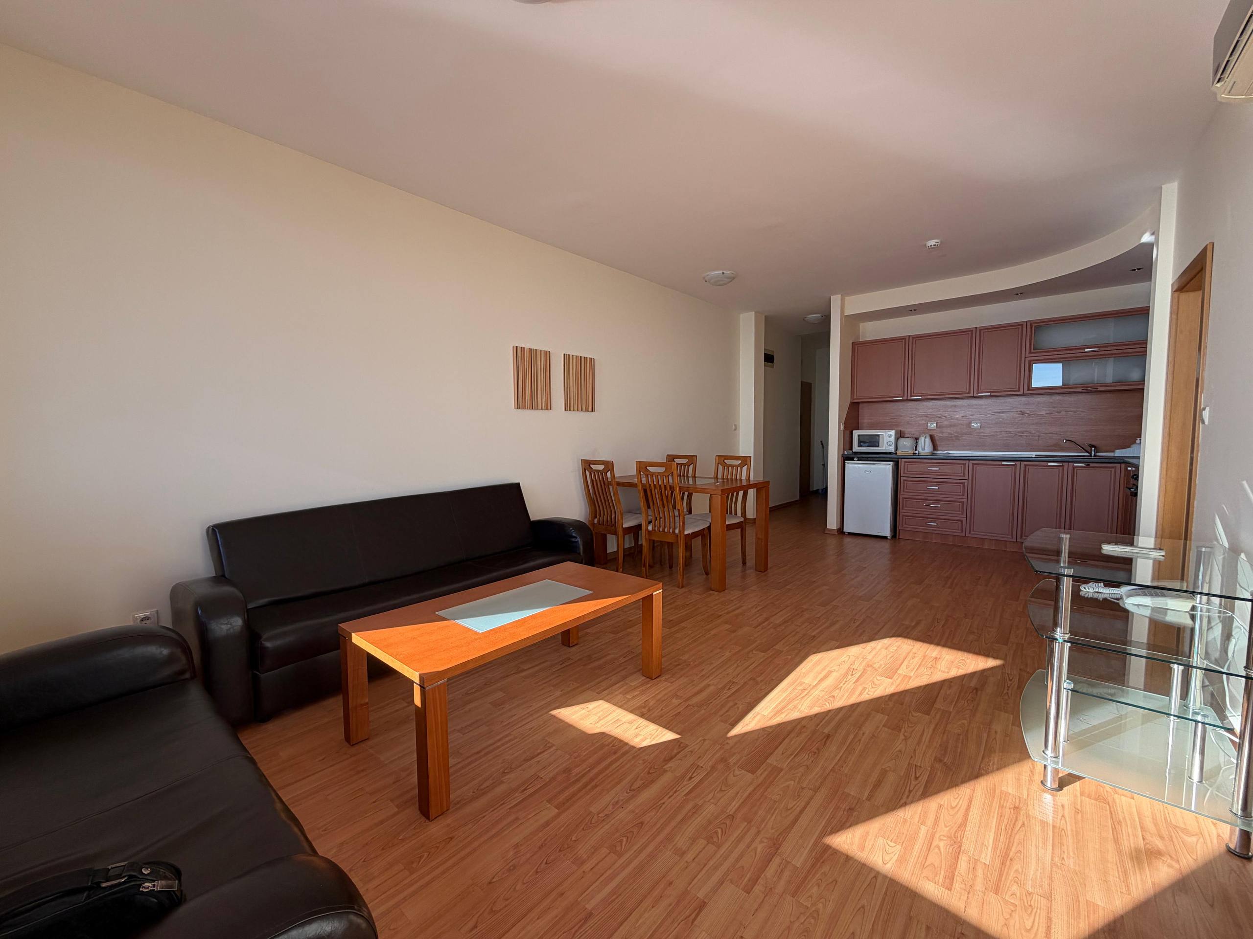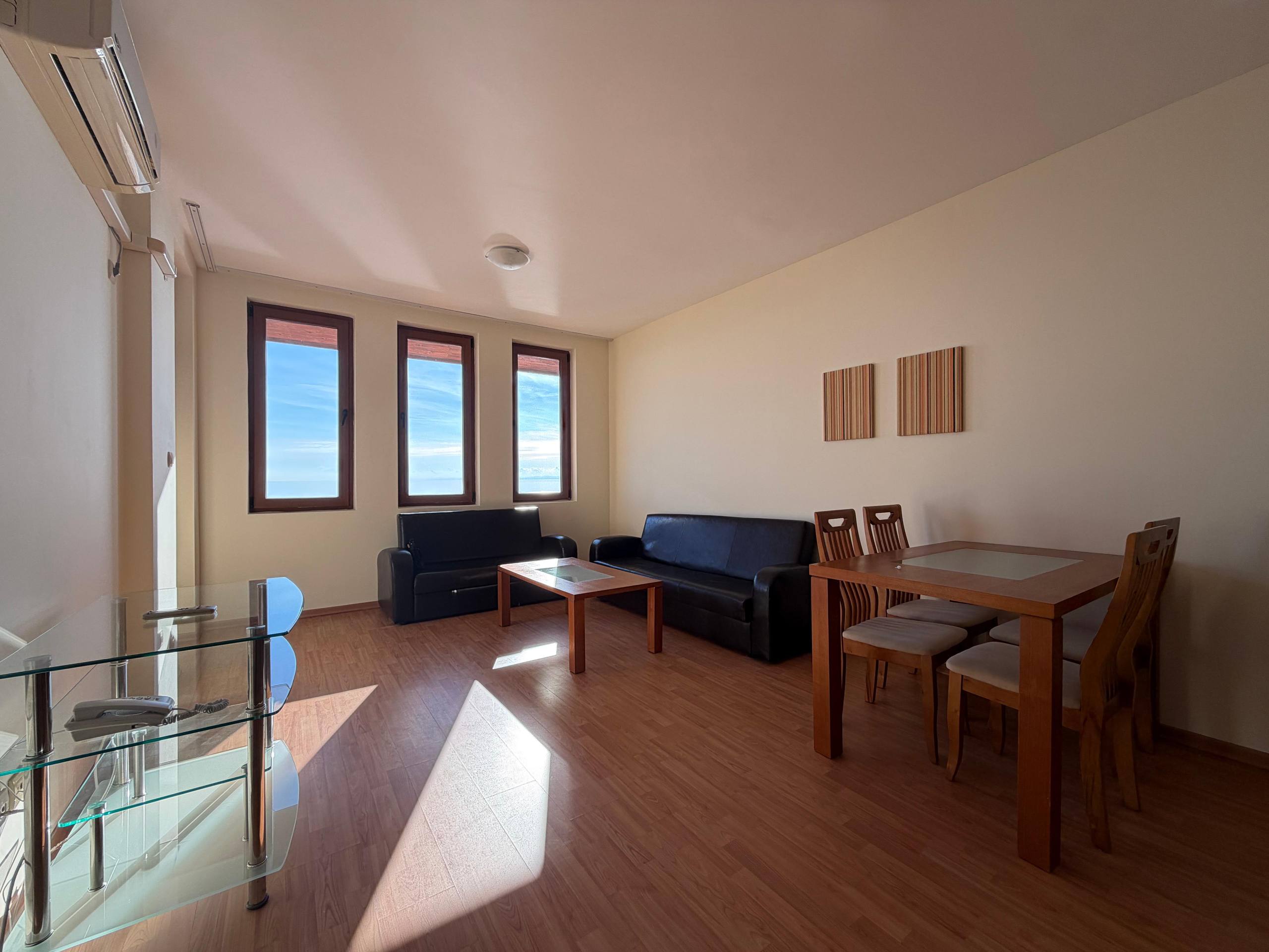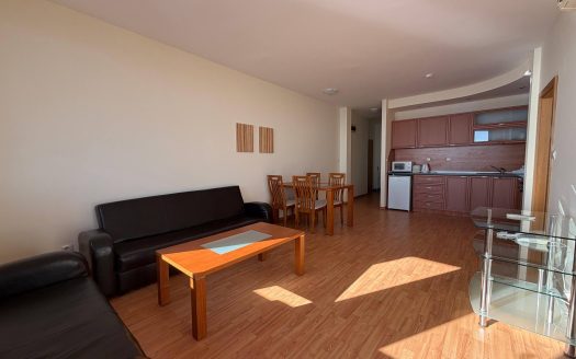 Квартира находится на шестом этаже и занимает площадь 100 м². Планировка включает просторную гостиную с кухонной зоной, две отдельные спальни и санузел. Из квартиры открывается панорамный вид на море, который является одним из главных преимуществ объекта. Наличие террасы позволяет наслаждаться морским воздухом и красивыми закатами. Такой формат квартиры в Святом Власе подходит как для постоянного проживания семьи, так и для сдачи в аренду туристам или долгосрочным арендаторам.