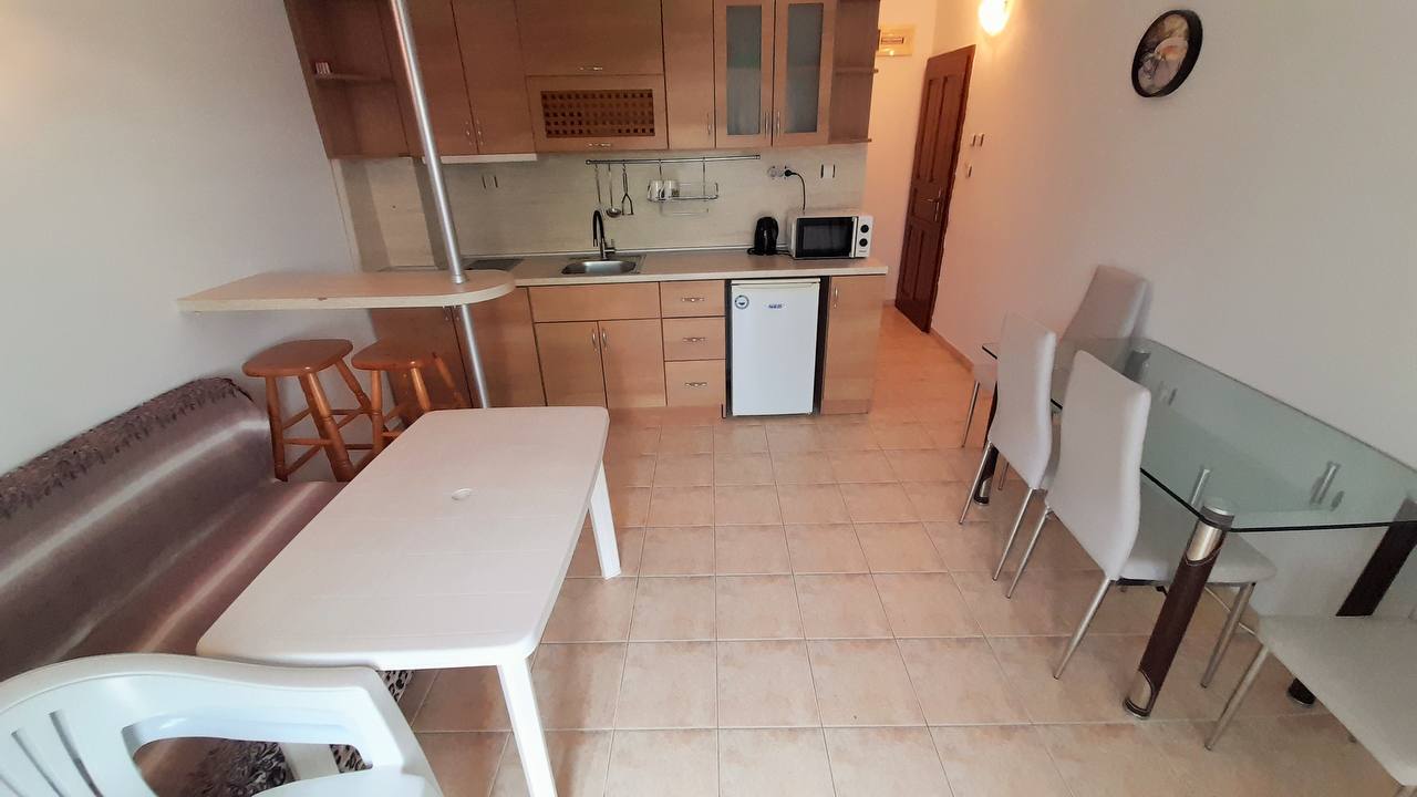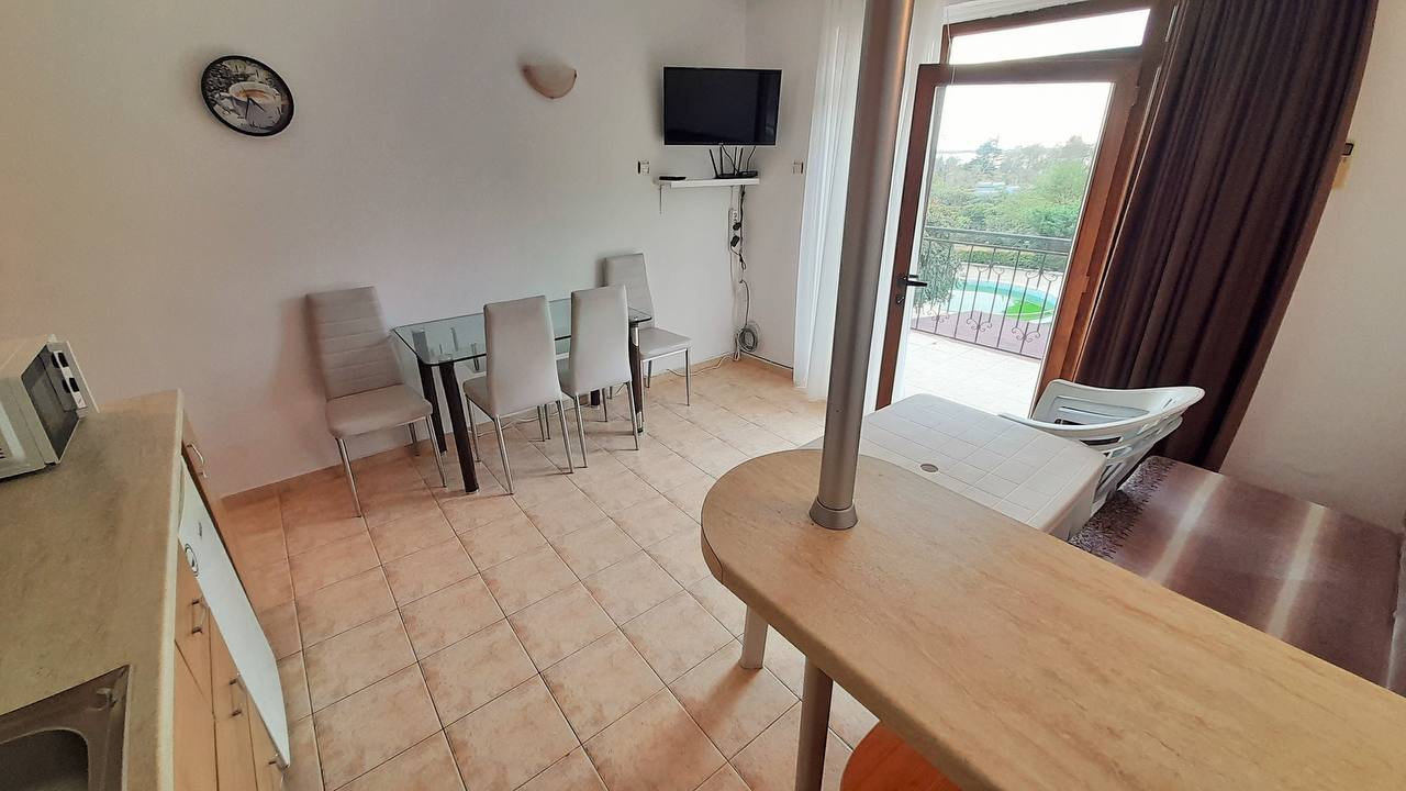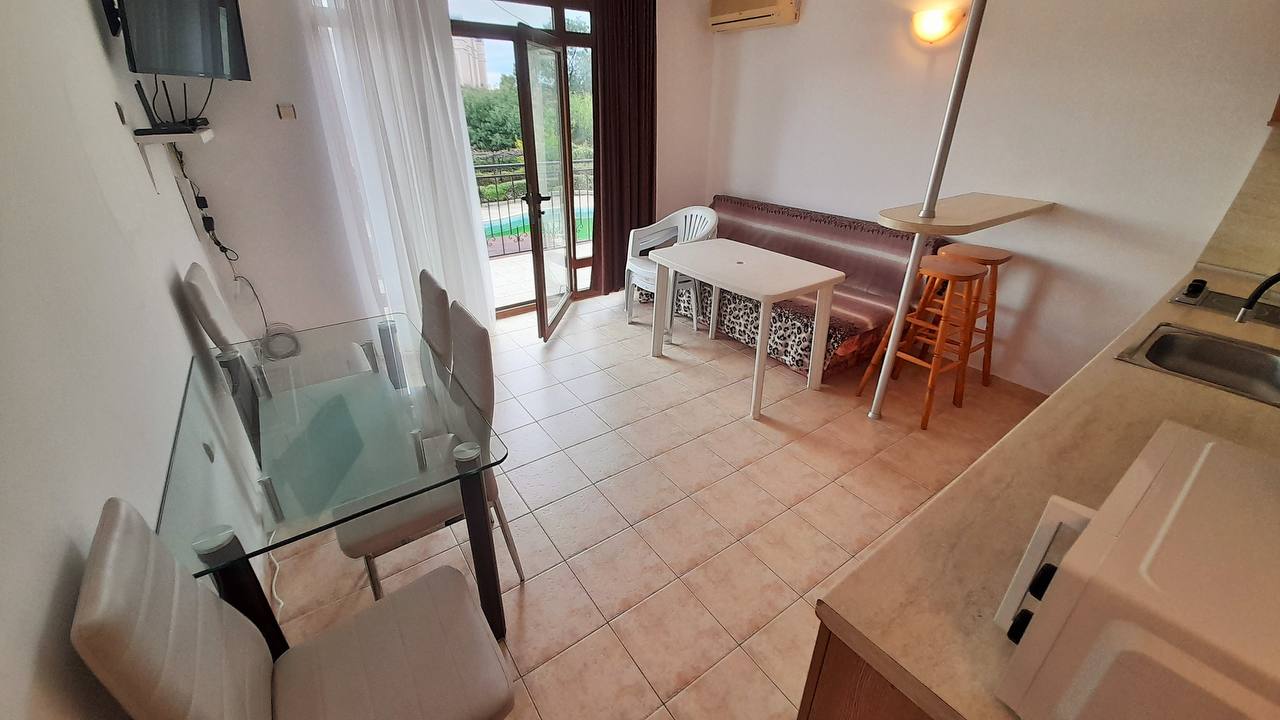 Villa 4-2, Sveti Vlas - cozy one bedroom apartment 100 meters from the sea, overlooking the pool and the sea panorama, well-maintained territory and low service tax. Ideal place for vacation, residence and reliable investment in real estate on the Bulgarian coast.