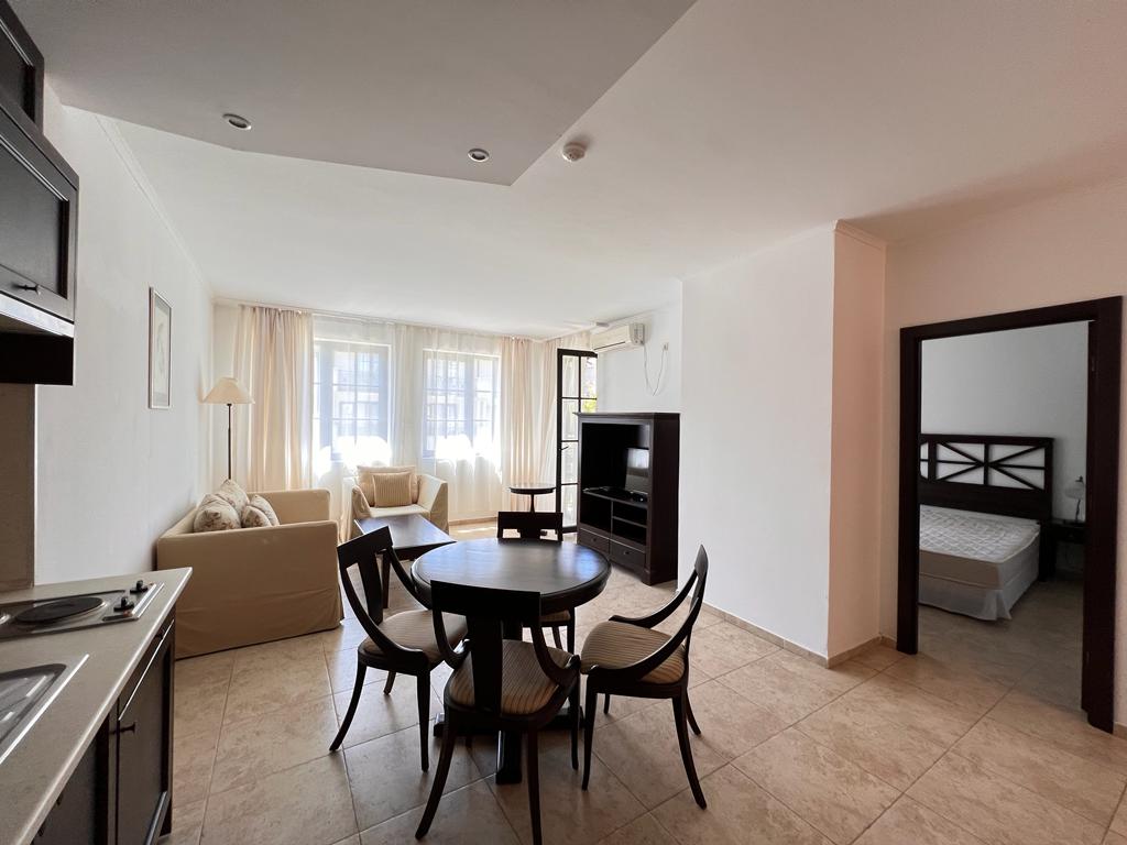 Предлагается меблированная квартира с одной спальней в современном комплексе на первой линии моря. Апартамент площадью 76 м² расположен на втором этаже и состоит из просторной гостиной с кухонной зоной, спальни, ванной комнаты и балкона с приятным видом на бассейн и зелёную территорию комплекса.