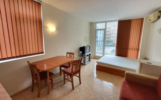 Студия находится в одном из самых удобных и спокойных районов Солнечного Берега, всего в 500 метрах от моря. Из окон открывается приятный вид на двор и бассейн, что делает жилье особенно комфортным для отдыха.