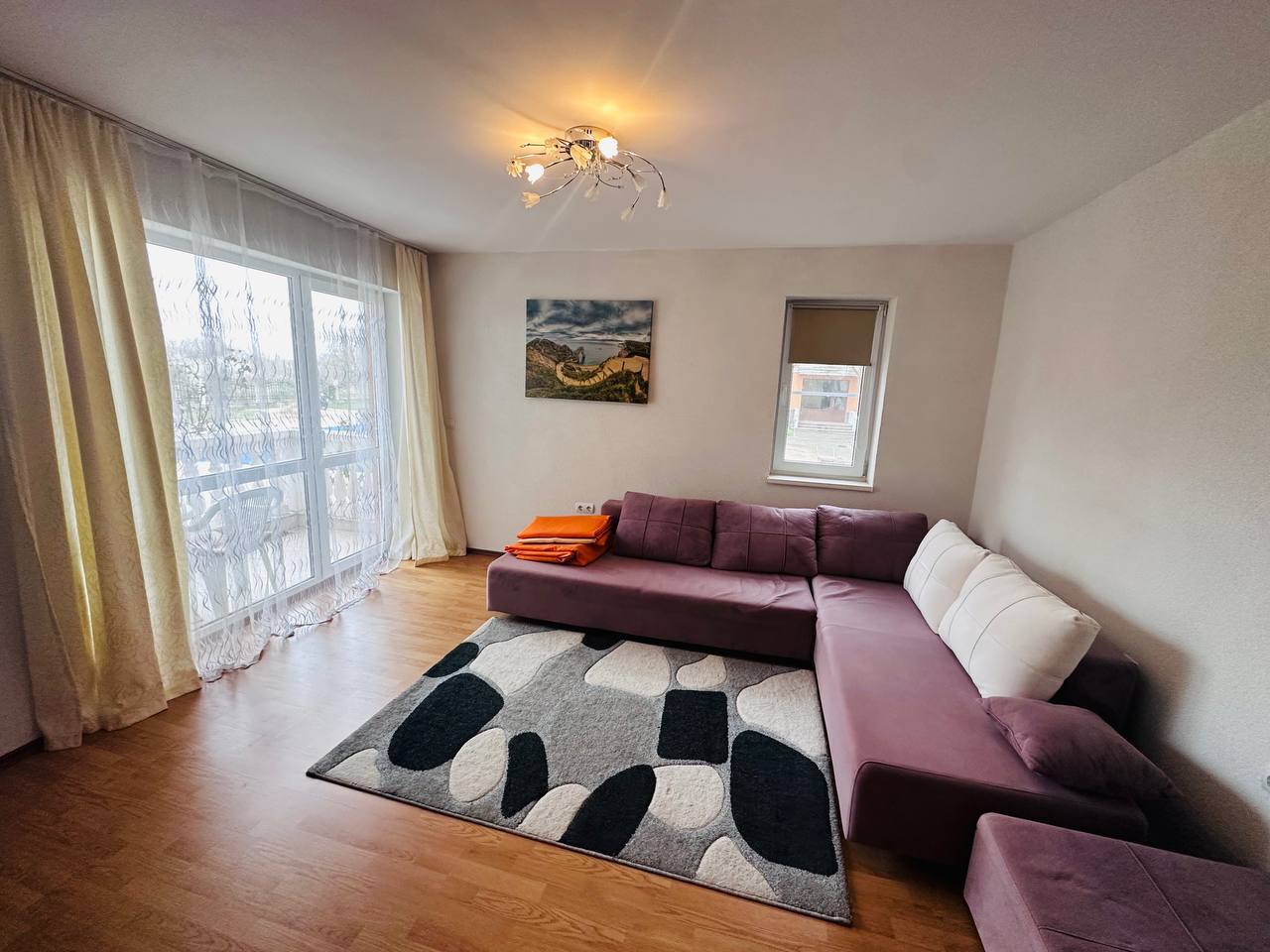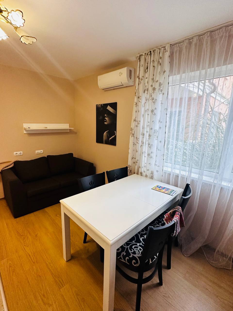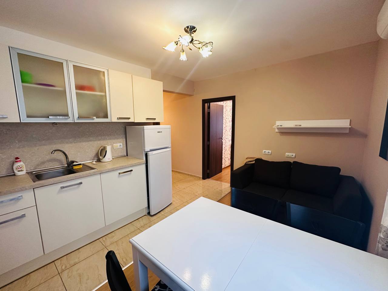 Предлагаем просторную квартиру с двумя спальнями в современном комплексе Sea Diamond на курорте Солнечный берег. Жилье расположено на высоком 1 этаже, его площадь по документам составляет 78 кв.м, но фактическая — больше, так как объект представляет собой объединение студии и двухкомнатной квартиры. Стоимость — 135 000 евро, ежегодная такса обслуживания — 12 евро/кв.м. Возможна рассрочка до 1 года, что делает покупку максимально удобной.