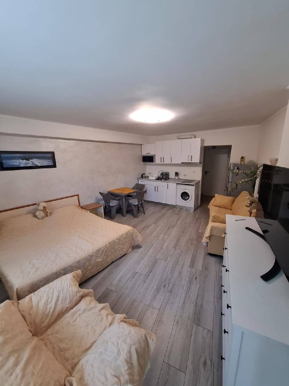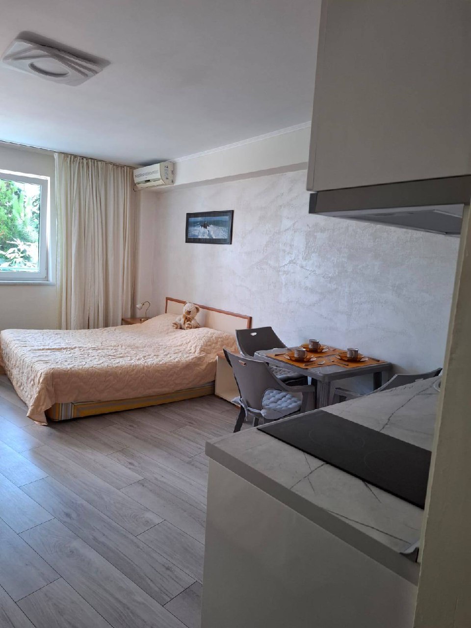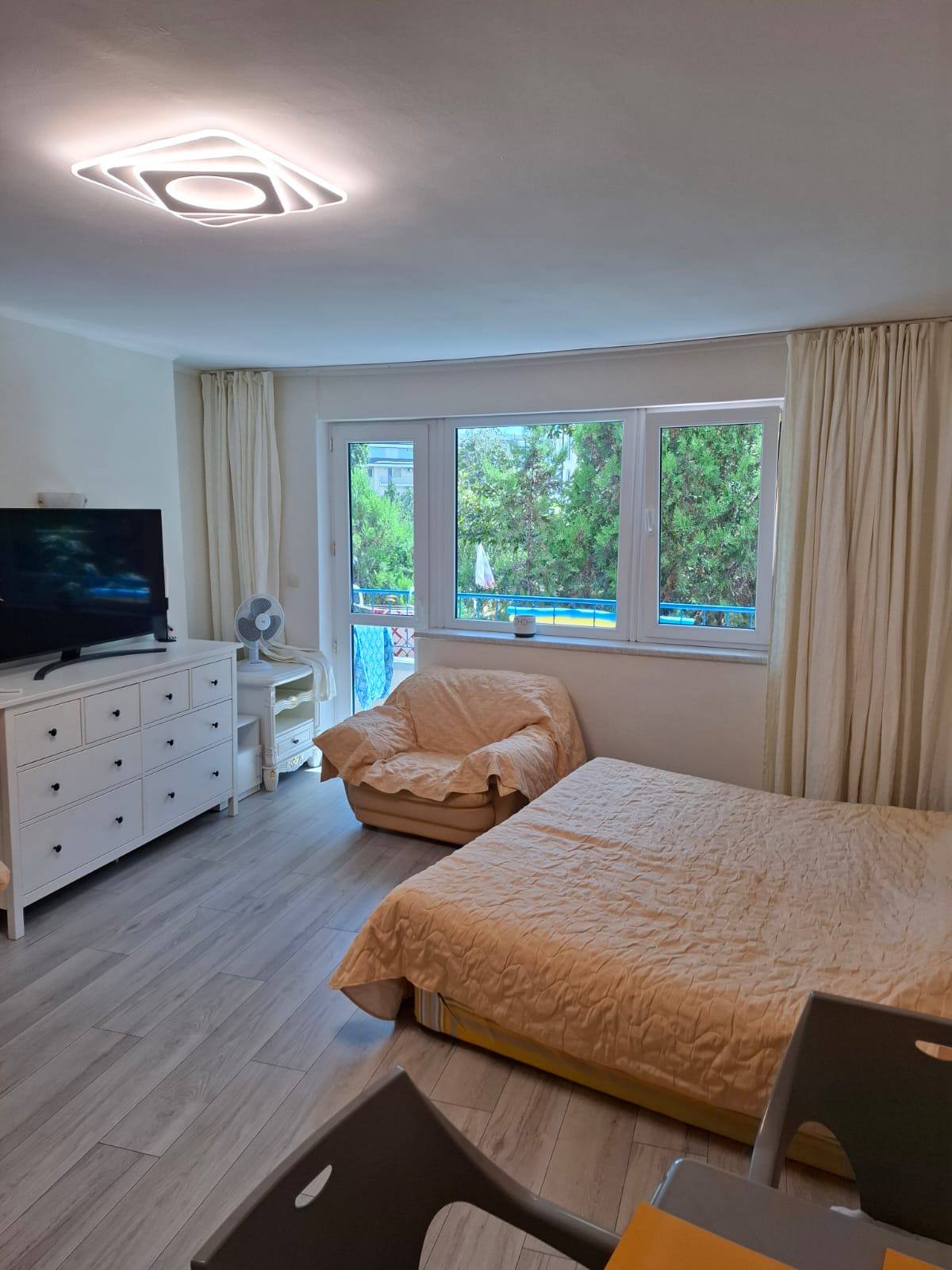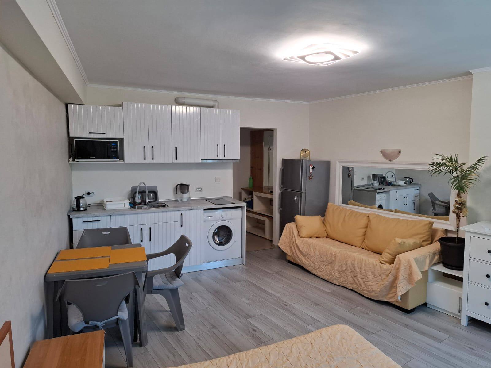 Квартира находится на втором этаже и имеет общую площадь 45 квадратных метров, что значительно превышает стандартные размеры студий. Планировка включает просторную жилую зону с кухней и отдельную ванную комнату с туалетом. Окна выходят на зеленую зону комплекса, обеспечивая приятный вид и тишину. Такая квартира подходит как для постоянного проживания, так и для сезонного отдыха. Благодаря хорошей теплоизоляции, она комфортна не только летом, но и в межсезонье.