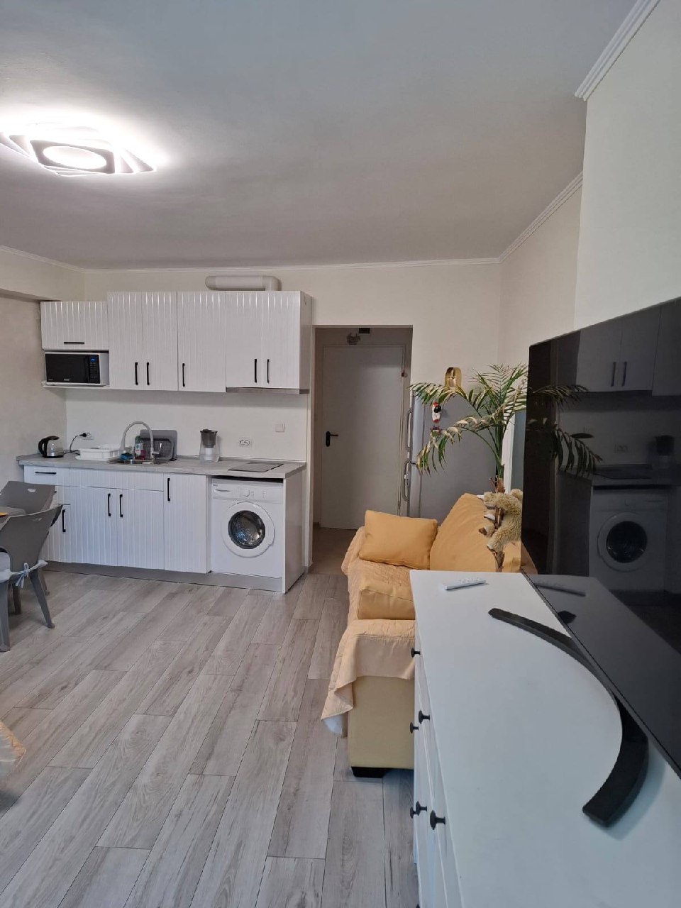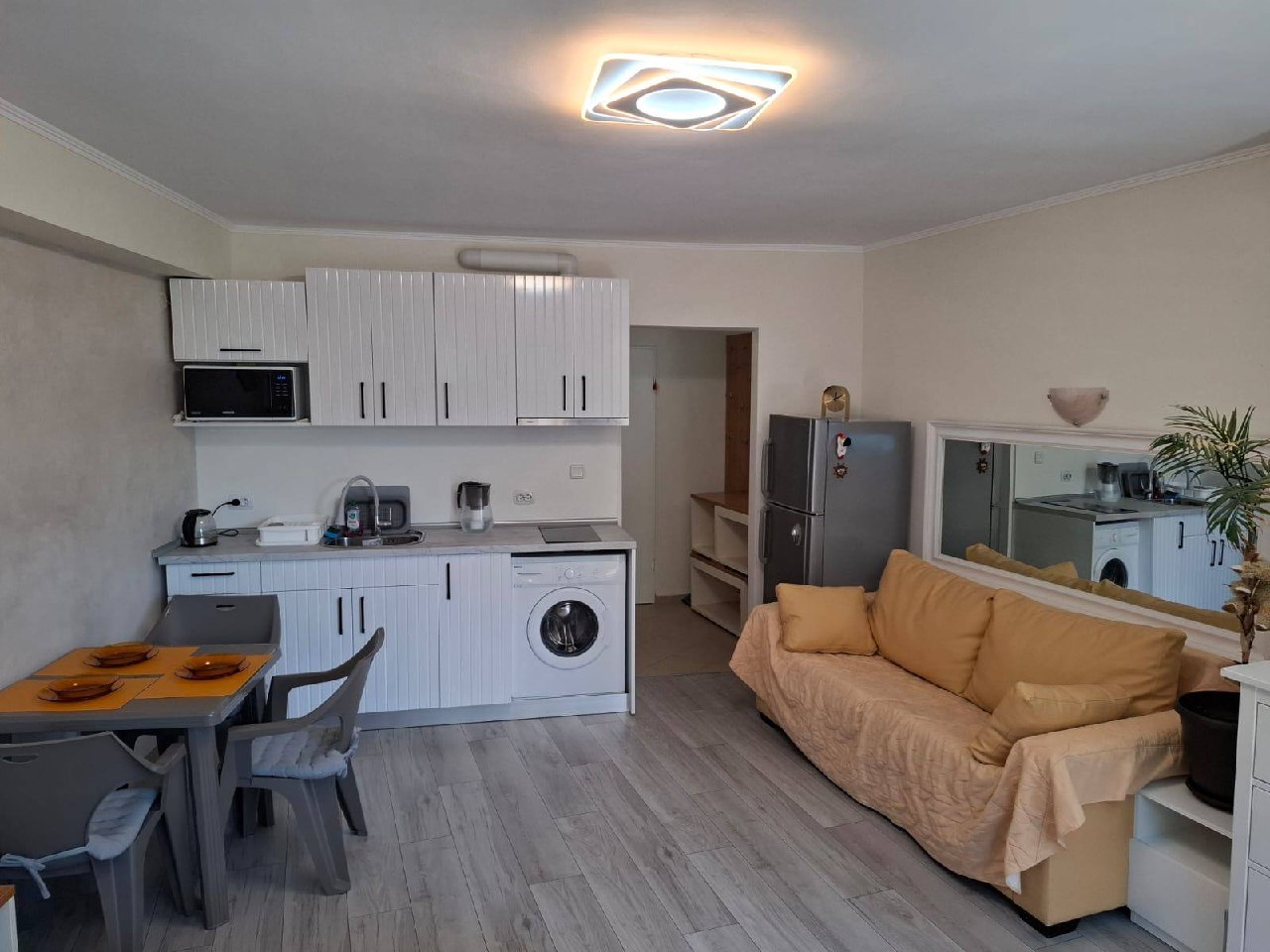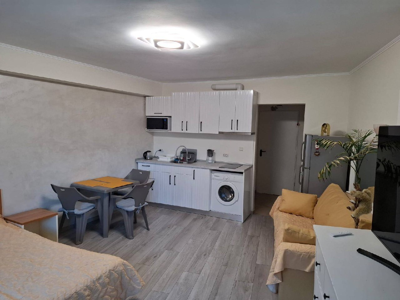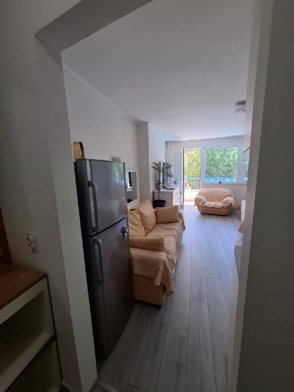 Квартира находится на втором этаже и имеет общую площадь 45 квадратных метров, что значительно превышает стандартные размеры студий. Планировка включает просторную жилую зону с кухней и отдельную ванную комнату с туалетом. Окна выходят на зеленую зону комплекса, обеспечивая приятный вид и тишину. Такая квартира подходит как для постоянного проживания, так и для сезонного отдыха. Благодаря хорошей теплоизоляции, она комфортна не только летом, но и в межсезонье.