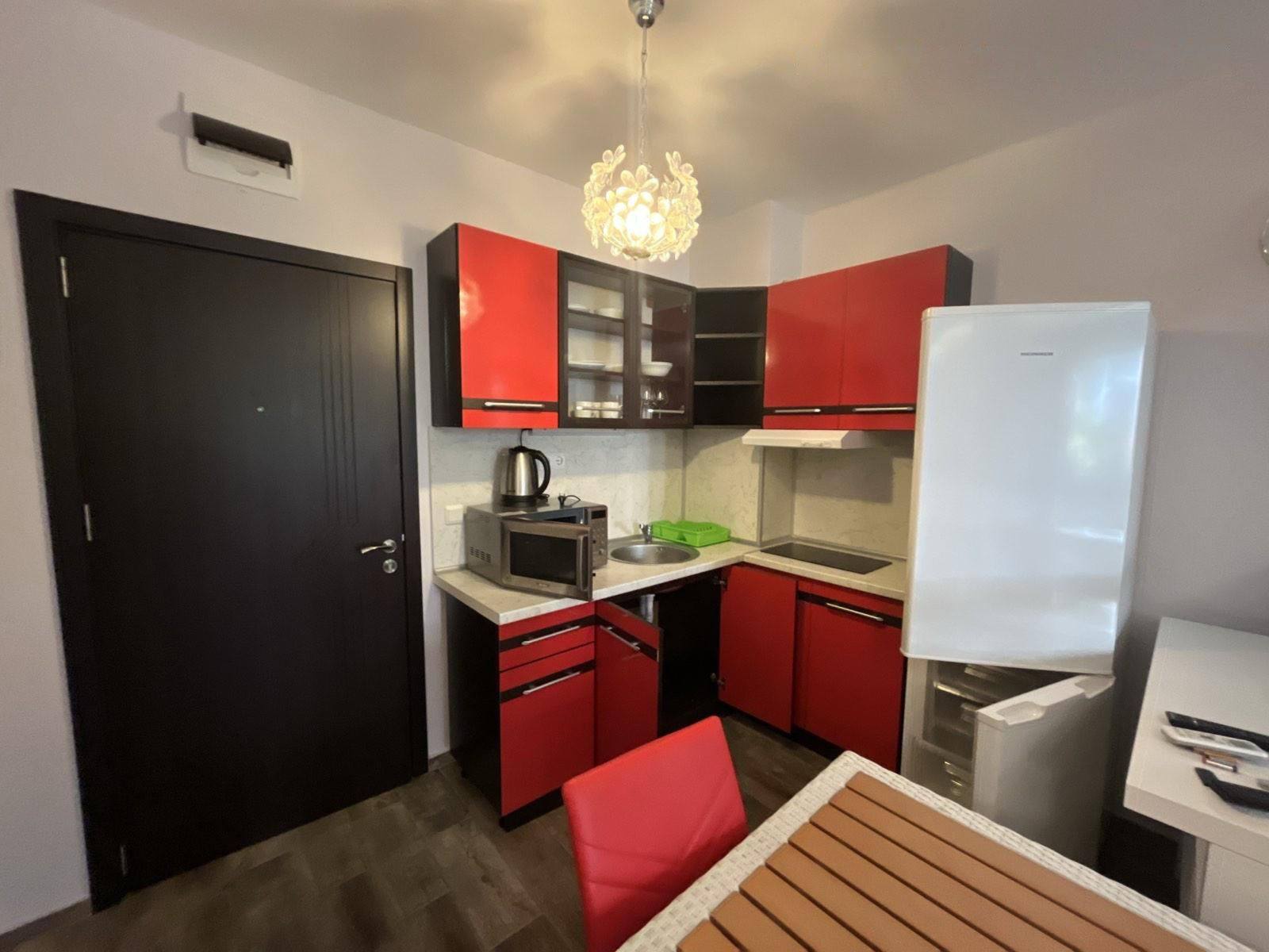 Апартамент на партерном этаже обеспечивает удобный доступ. Общая площадь составляет 45 квадратных метров, что создаёт ощущение простора. Открытая планировка объединяет жилую зону, кухню и обеденную часть. Квартира продаётся полностью меблированной, что позволяет сразу использовать её.