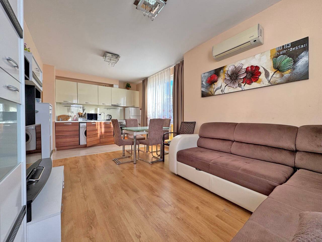 Продаётся трёхкомнатная квартира в комплексе Messembria Palace на курорте Солнечный берег. Идеальный вариант для семейного проживания или для инвестиций в аренду. Удобная планировка и вид на бассейн делают этот объект привлекательным для жизни и сдачи в аренду.