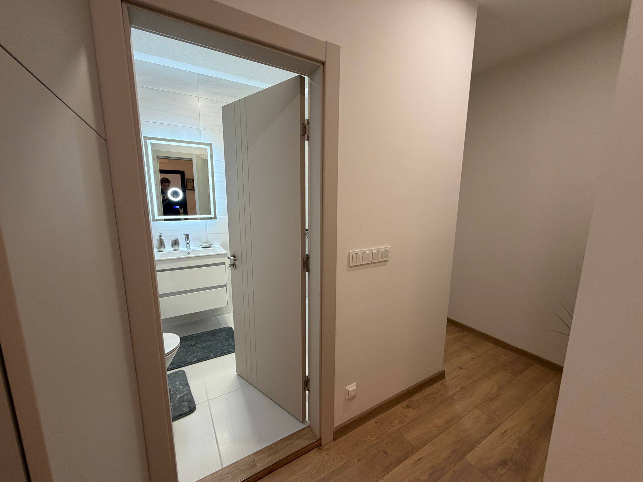 Квартира на втором этаже с площадью 80,37 м². Планировка включает светлую гостиную с кухонной зоной и выходом на балкон, две изолированные спальни, просторный санузел с подогревом пола и прихожую. Окна ориентированы на восток и запад, что обеспечивает равномерное освещение и хорошую вентиляцию.