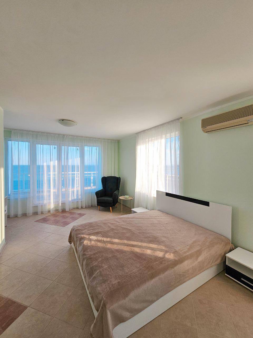 Пентхаус на шестом этаже площадью 197 м² включает просторную гостиную с кухней, две спальни и два санузла. Большая терраса с панорамным видом на море создаёт уникальную атмосферу. Новый ремонт и обновлённая мебель позволяют сразу заселиться.