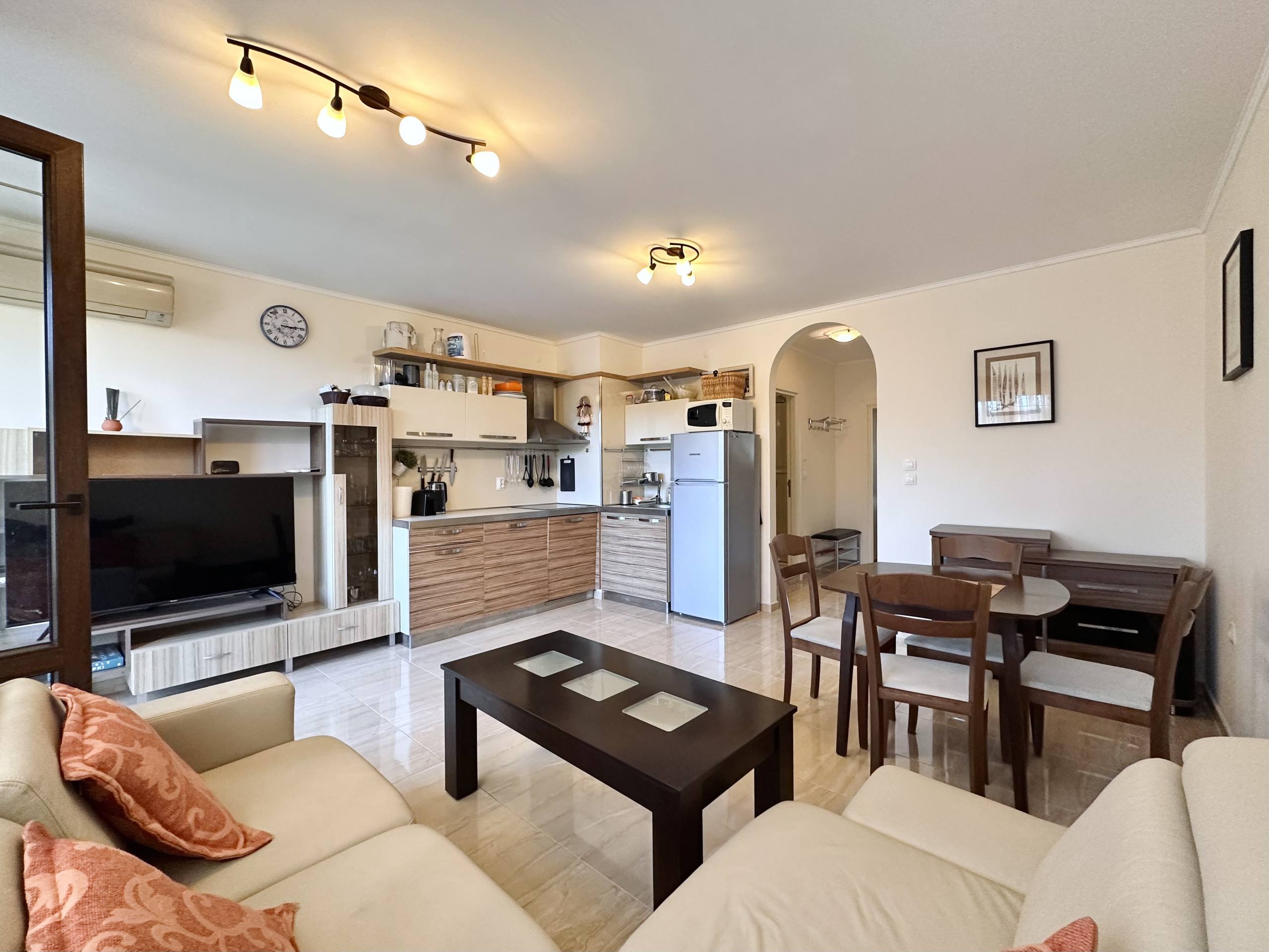 Квартира площадью 74 квадратных метра находится на третьем этаже комплекса Esteban. Планировка включает просторную гостиную с кухонной зоной, отдельную спальню, коридор, санузел и балкон. Такой формат «гостиная + спальня» является одним из самых востребованных на рынке недвижимости в Болгарии, особенно для тех, кто рассматривает покупку квартиры у моря. Третий этаж обеспечивает хорошее естественное освещение и удобный доступ, что делает квартиру комфортной для проживания и привлекательной для аренды.