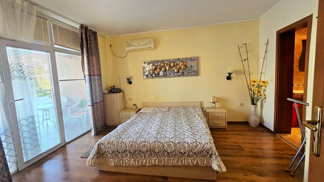 Він розташований у спокійному районі Сонячного берега, у пішій доступності від моря, магазинів, кафе, аптек і зупинок громадського транспорту.