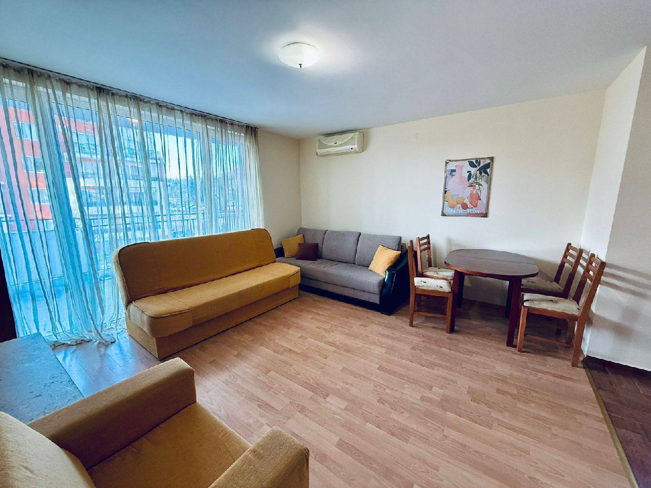 Квартира площадью 74 квадратных метра расположена на третьем этаже. В планировку входят просторная гостиная с кухонной зоной, отдельная спальня, коридор, ванная комната с туалетом и терраса с частичным видом на море. Такой формат подходит как для постоянного проживания, так и для сезонной аренды.