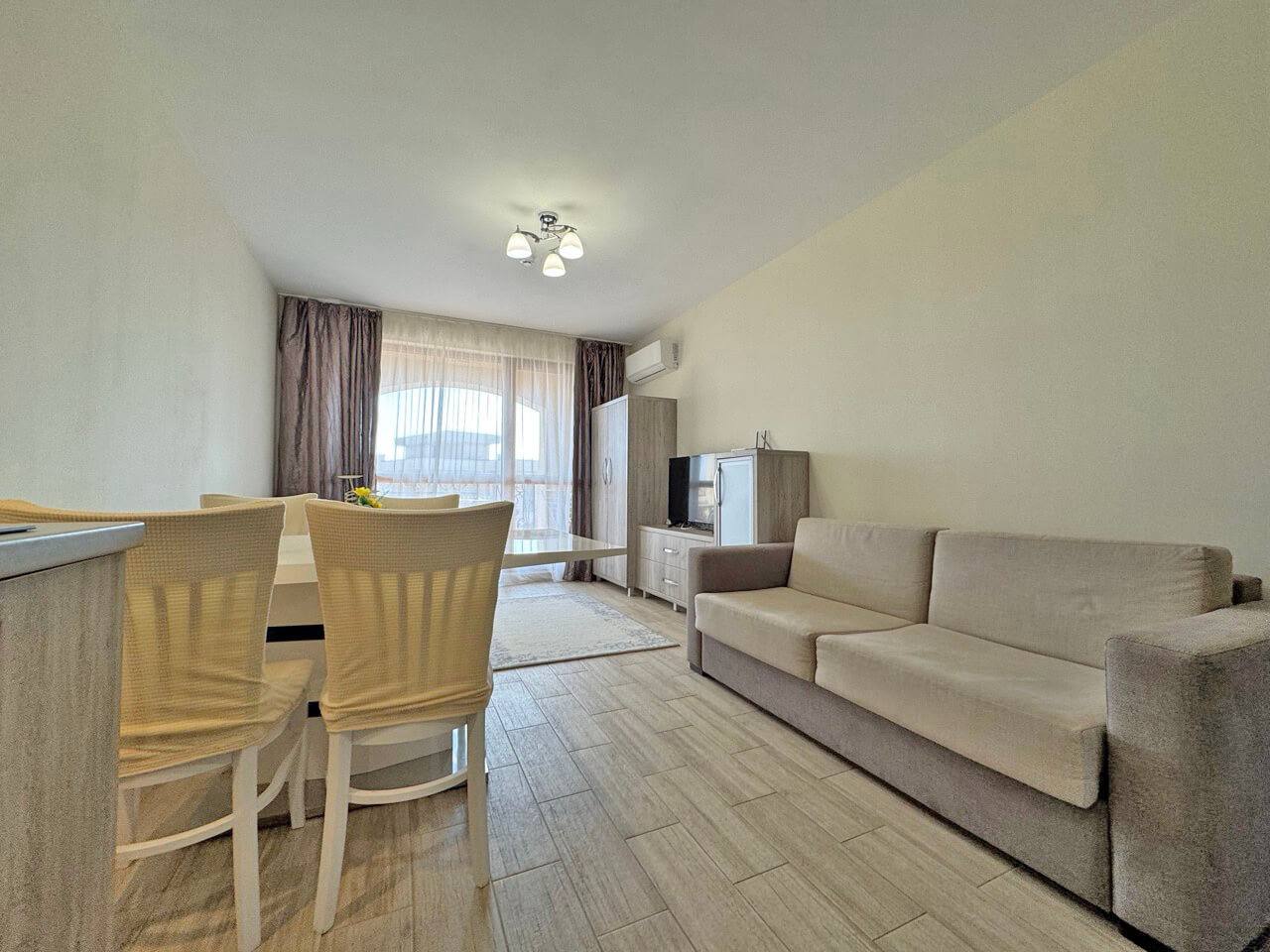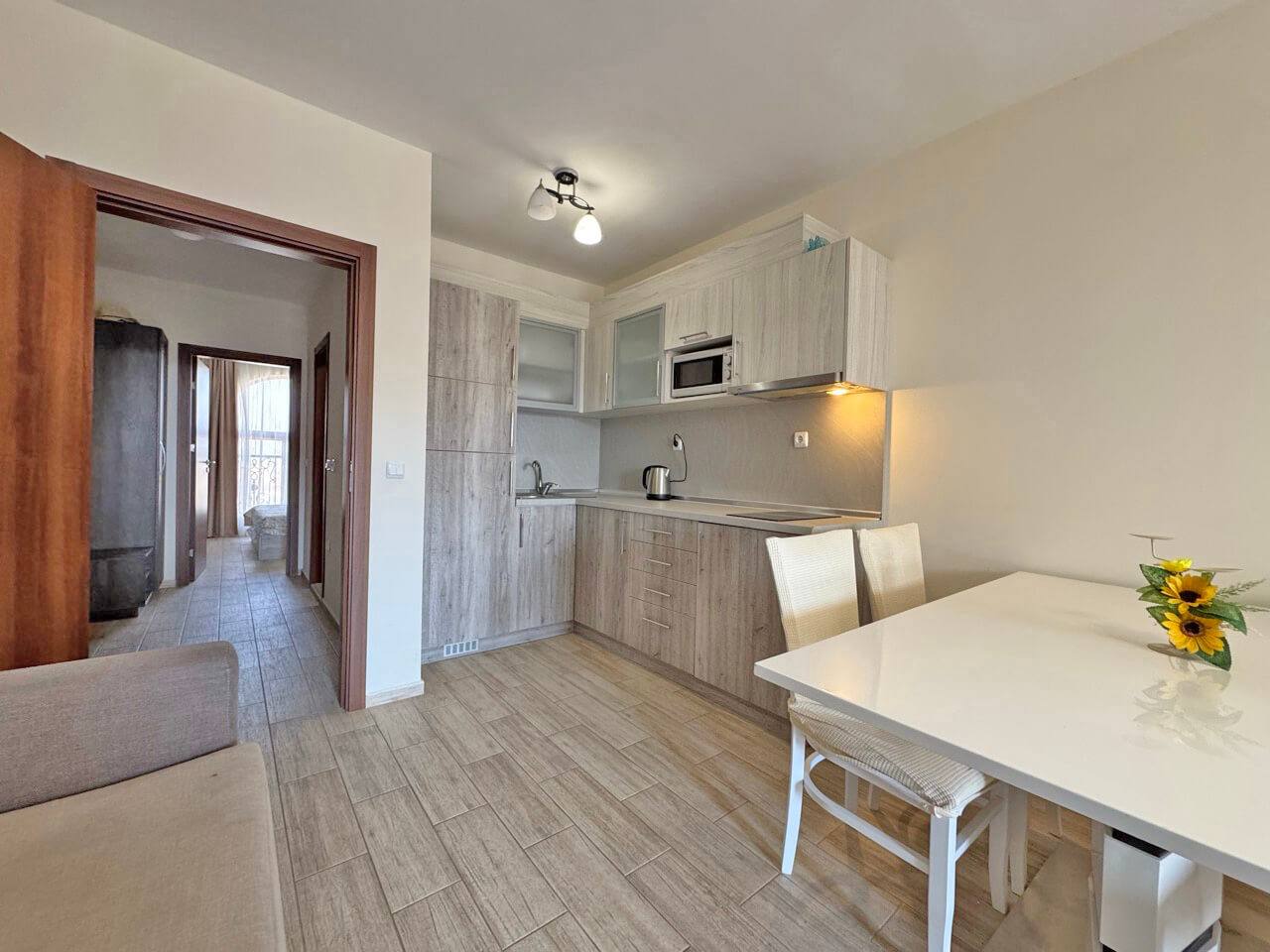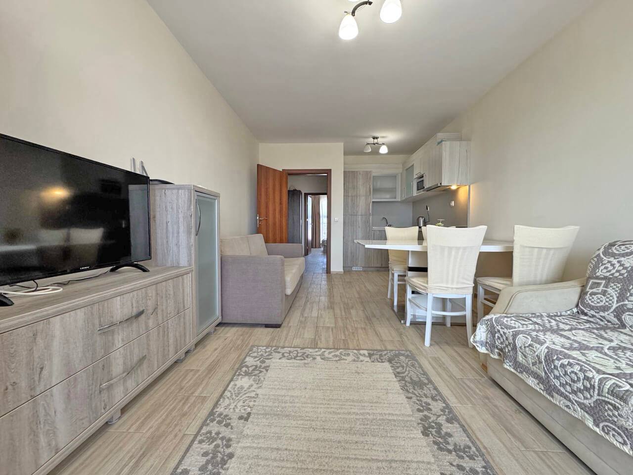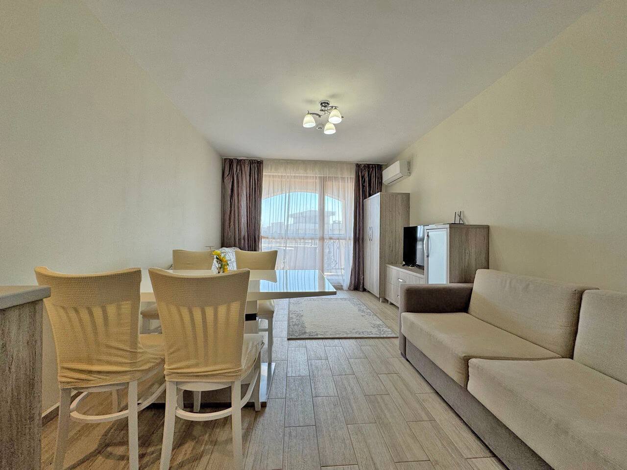 Комплекс находится в 10–12 минутах ходьбы от пляжа. Район отличается спокойной атмосферой и развитой инфраструктурой: рядом магазины, рестораны и транспортные остановки. Солнечный Берег — один из самых востребованных курортов Болгарии, что обеспечивает высокую ликвидность недвижимости.