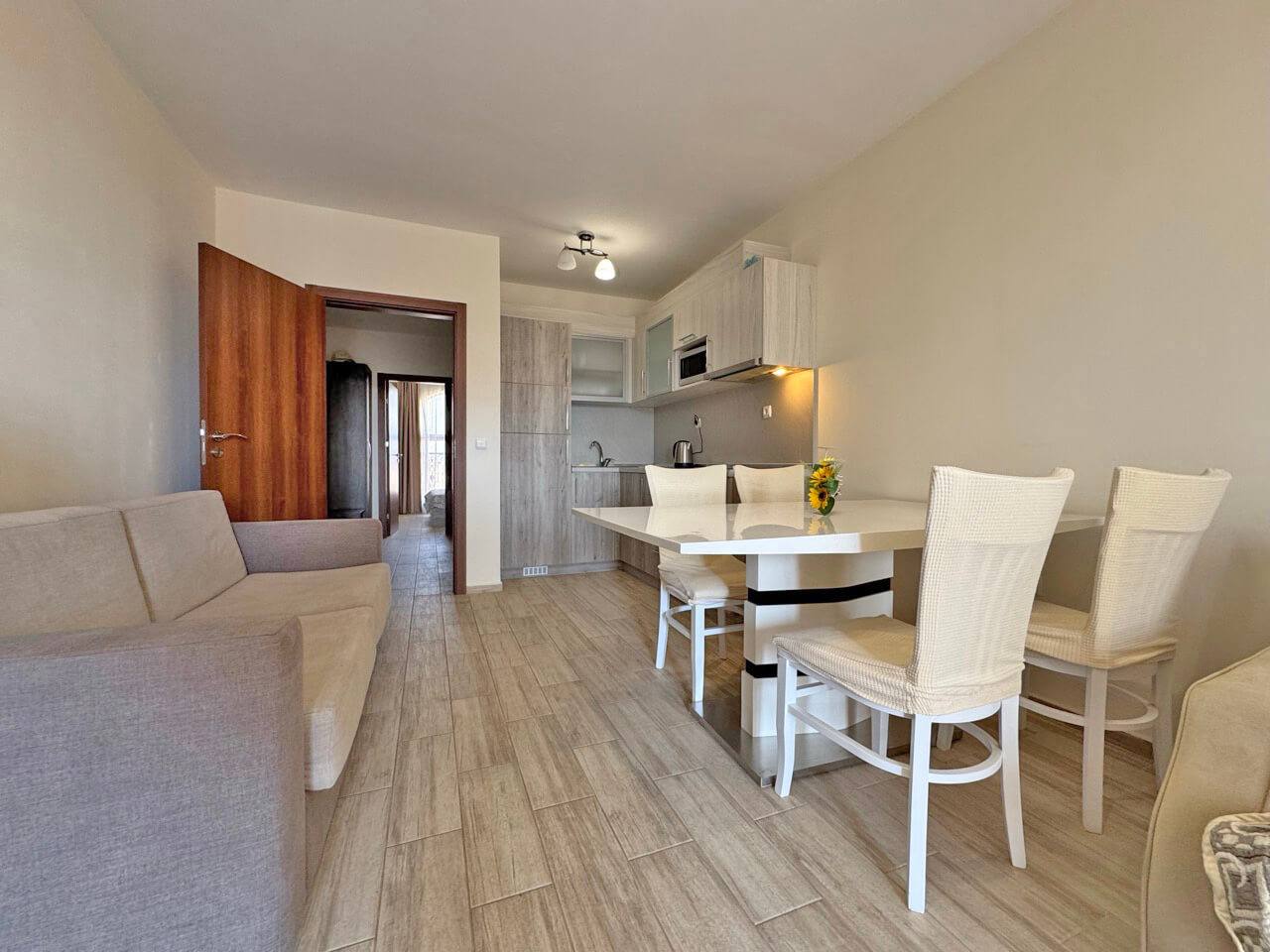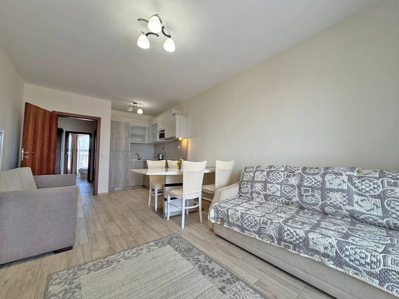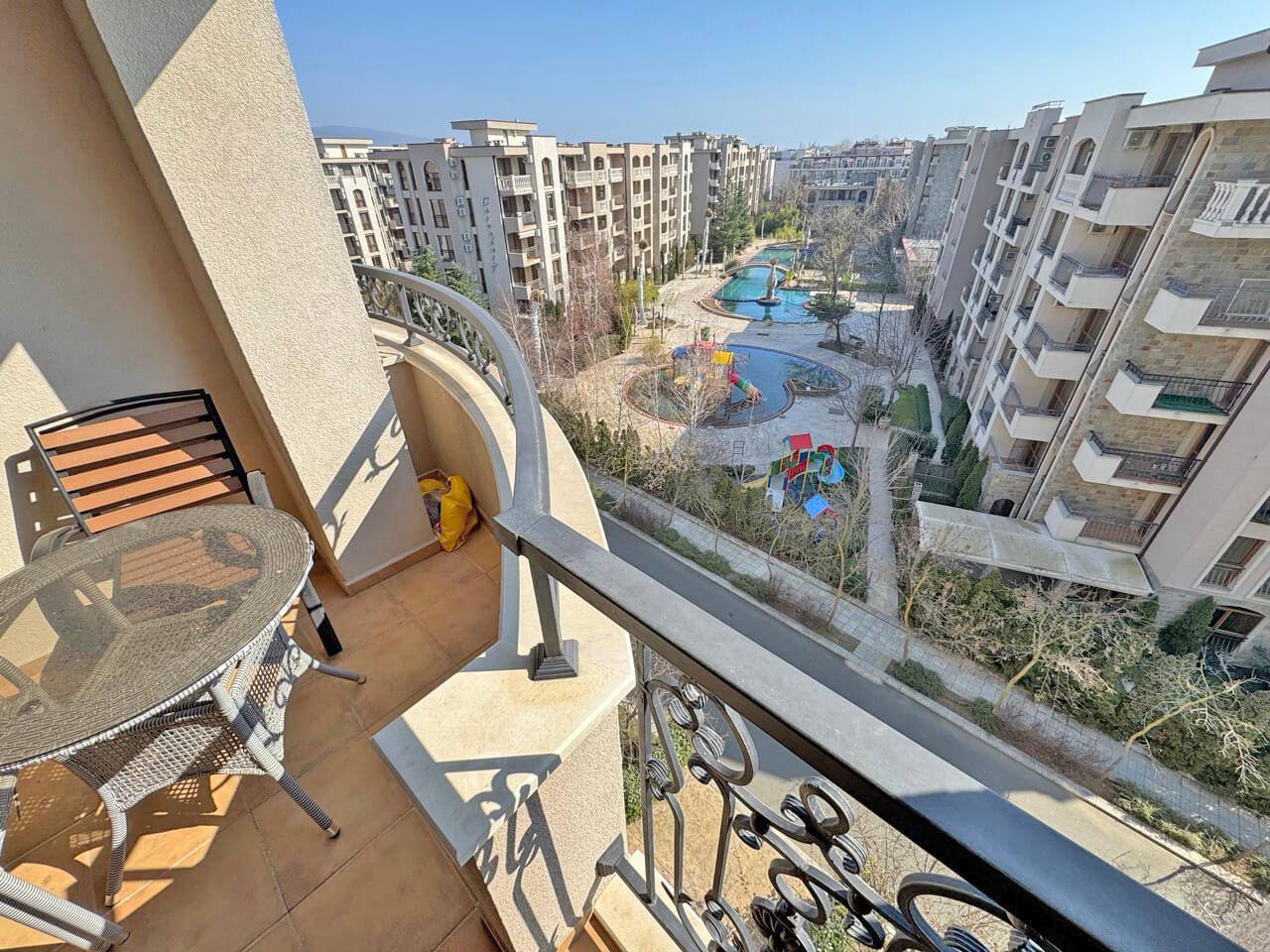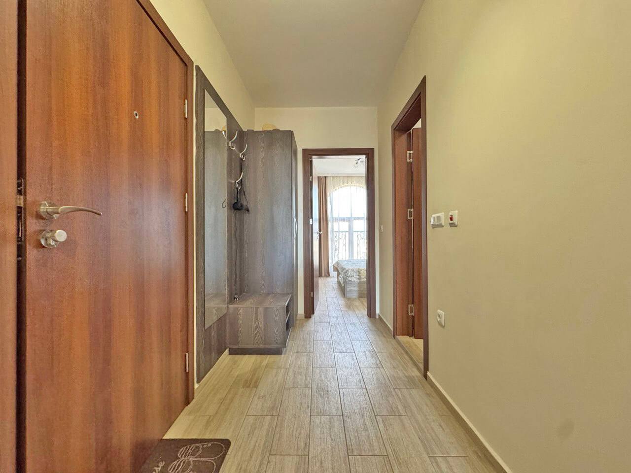 Комплекс находится в 10–12 минутах ходьбы от пляжа. Район отличается спокойной атмосферой и развитой инфраструктурой: рядом магазины, рестораны и транспортные остановки. Солнечный Берег — один из самых востребованных курортов Болгарии, что обеспечивает высокую ликвидность недвижимости.