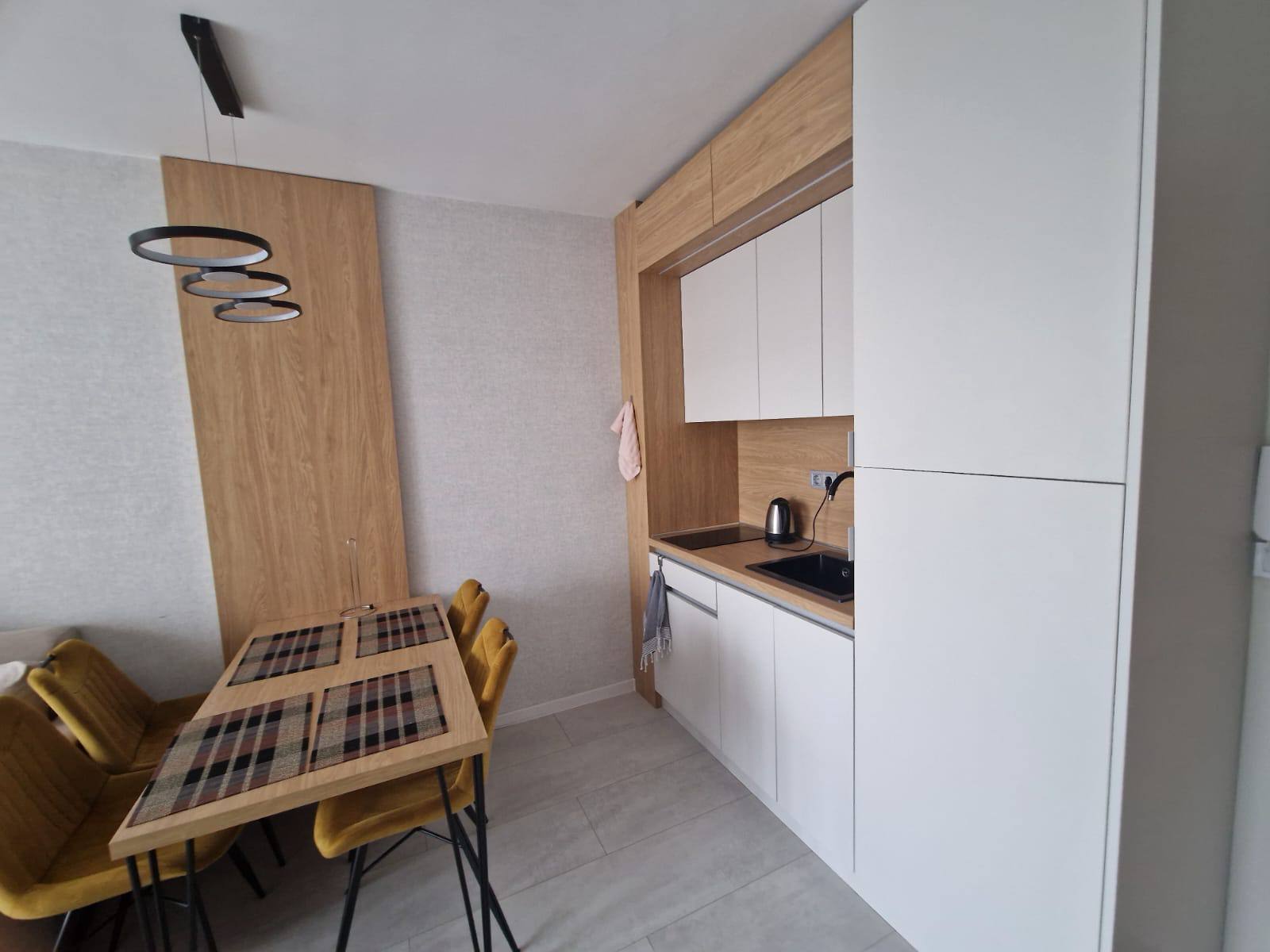 Квартира имеет классическую планировку с общей площадью 54 м², расположена на втором этаже дома 2024 года постройки. В помещении выделены гостиная с кухонной зоной и отдельная спальня, что обеспечивает комфортное пространство для пары или небольшой семьи. Планировка позволяет разместить полноценную кухню, обеденную зону, диванную группу и изолированную спальню без ощущения тесноты. Второй этаж выбран оптимально — он не слишком низкий, чтобы испытывать неудобства первого этажа, и не слишком высокий, что делает квартиру более востребованной среди арендаторов и покупателей.