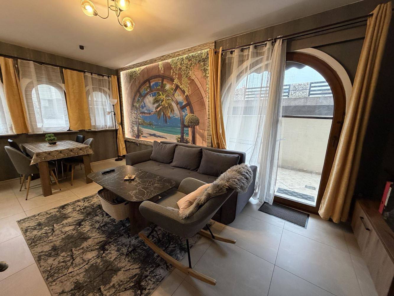 Квартира находится на партерном этаже, что обеспечивает удобный доступ. Общая площадь составляет 56 квадратных метров. В планировке предусмотрены просторная гостиная с кухонной зоной, отдельная спальня, ванная комната и терраса, что делает ее идеальной для жизни или аренды.