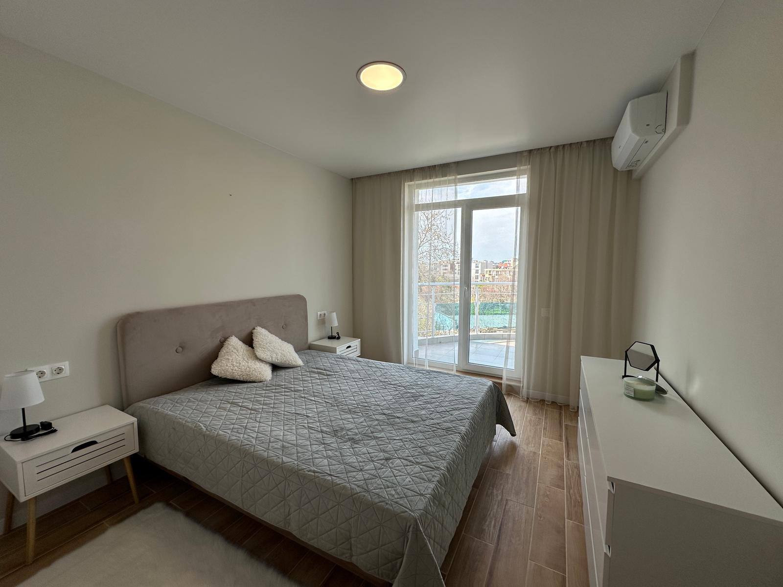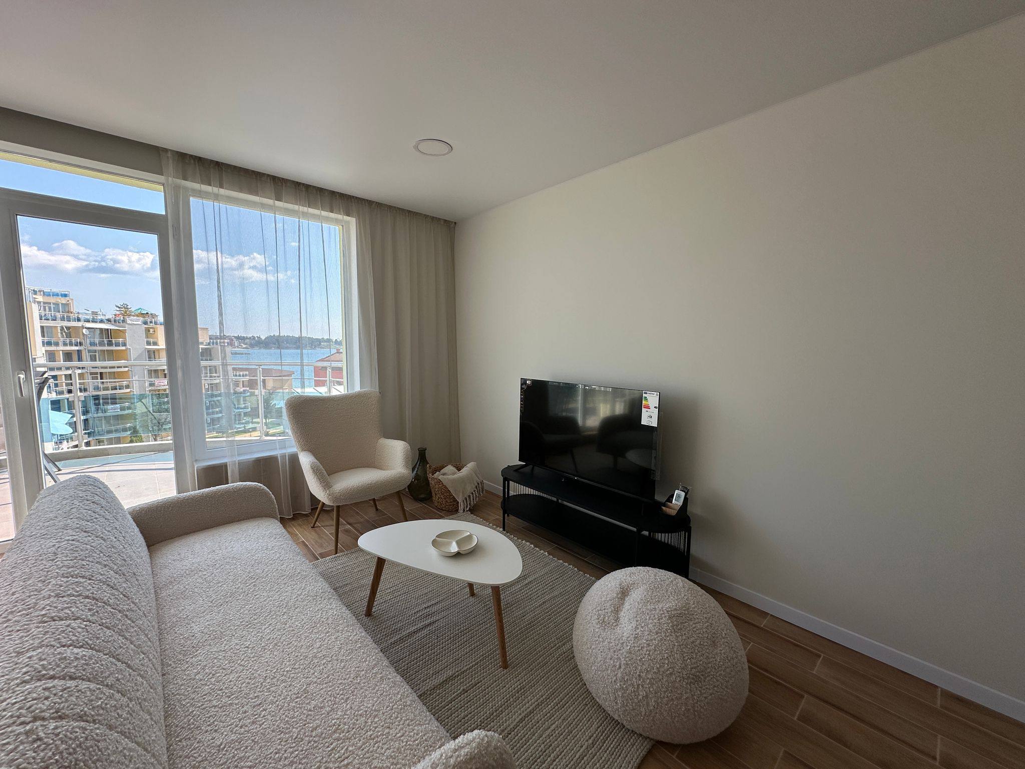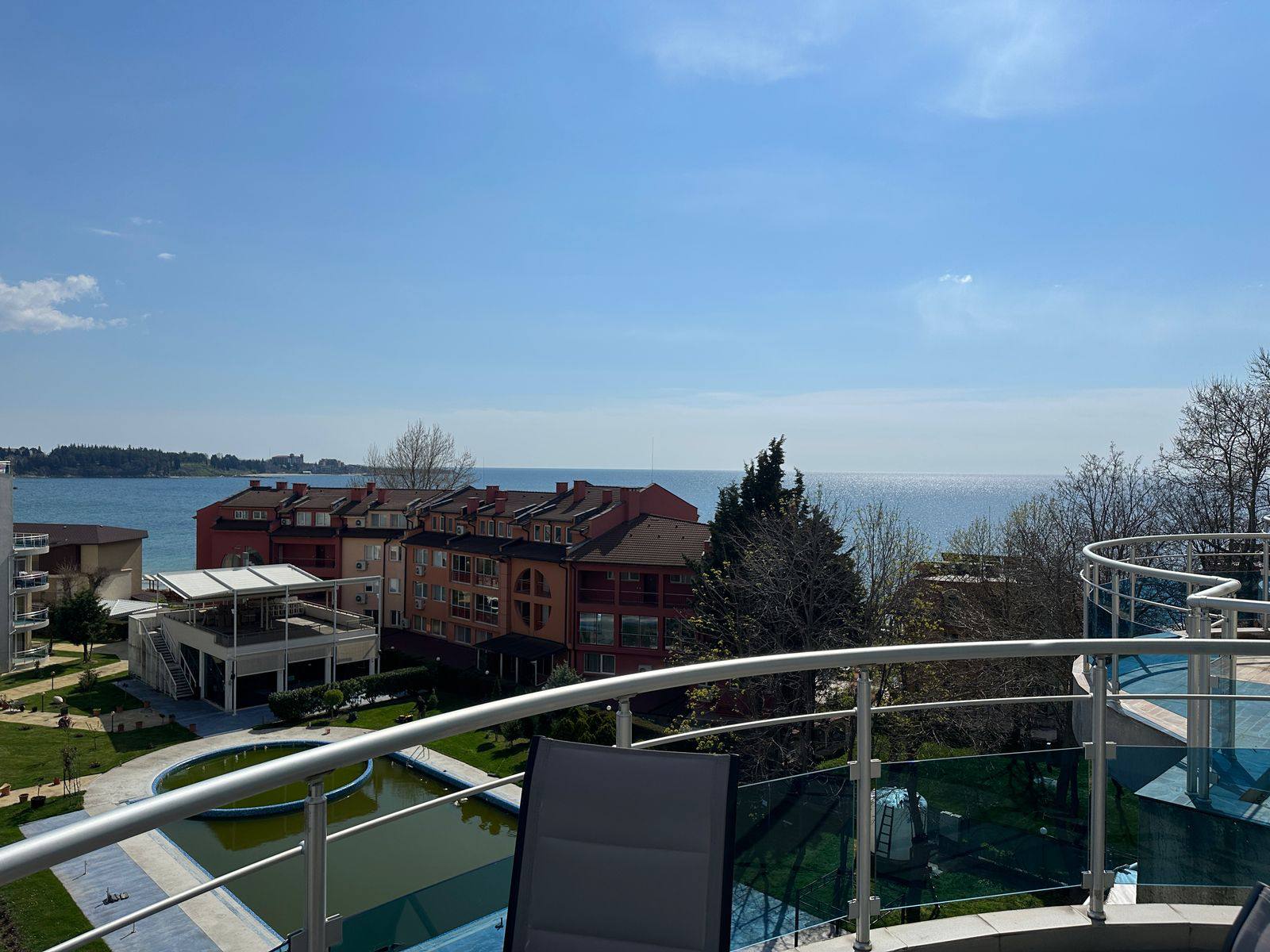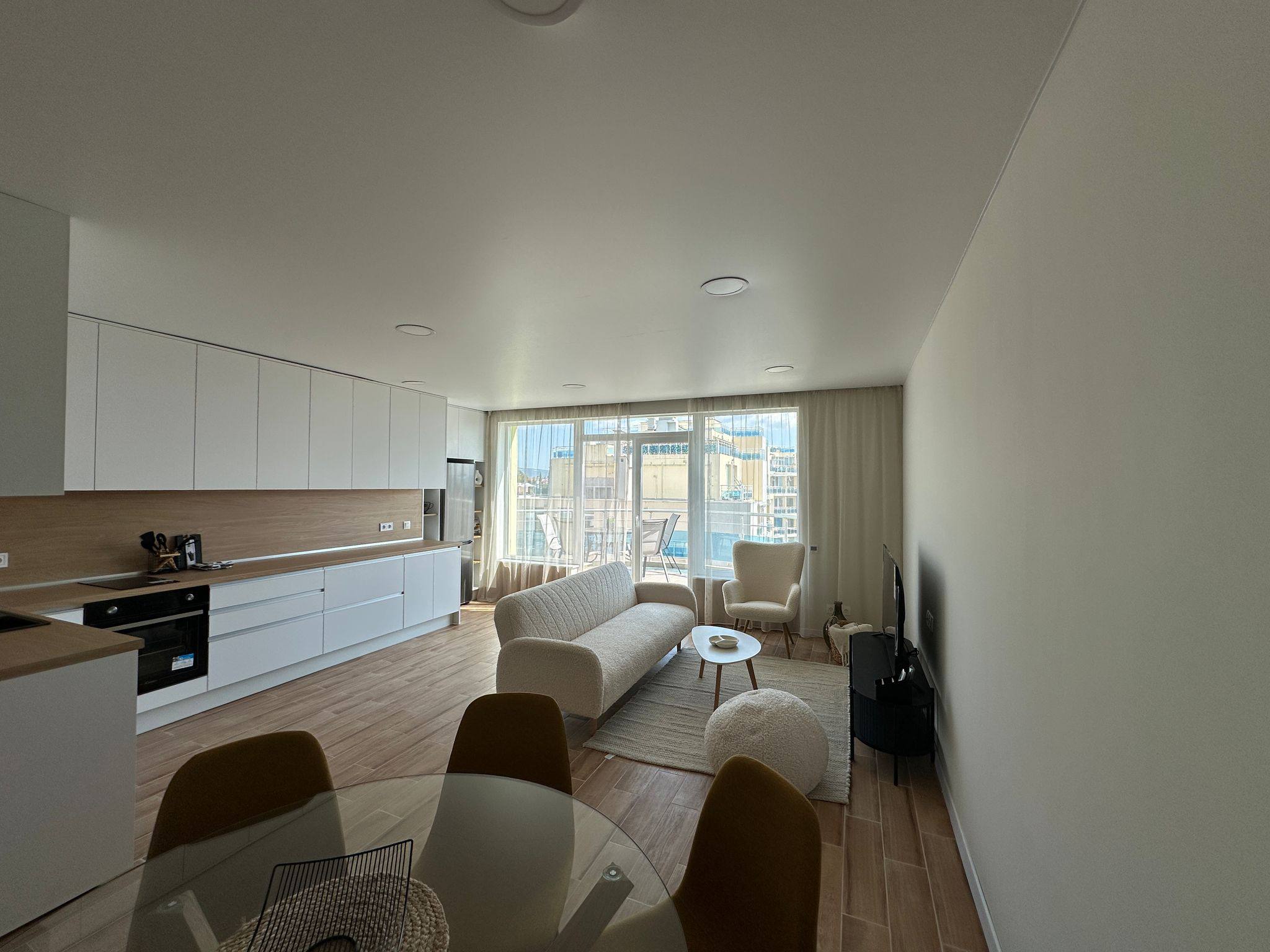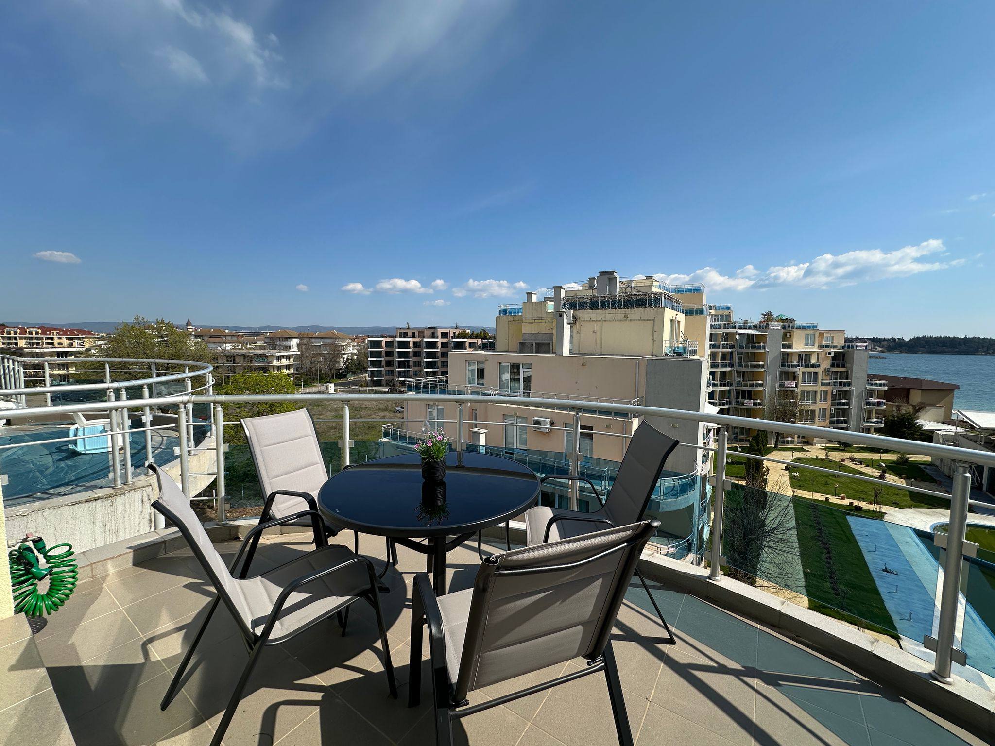 Однією з головних переваг апартаменту є велика тераса з гарним оглядами на море і територію комплексу. Це ідеальне місце для відпочинку, зустрічей із друзями або вечірнього розслаблення під шум хвиль.