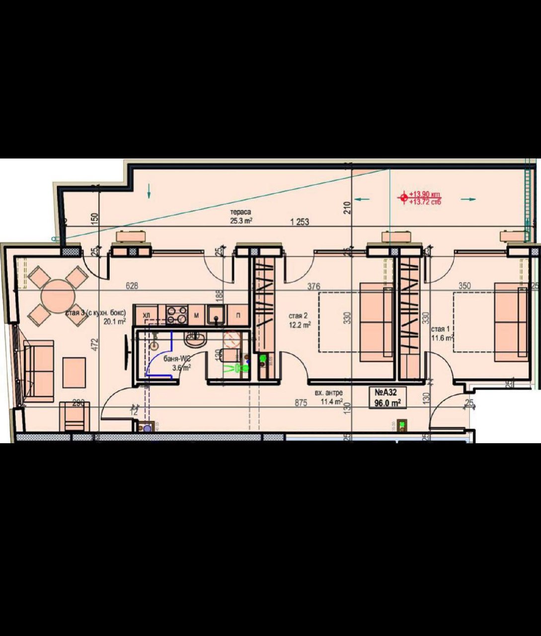 Пропонований апартамент №32 розташований на п'ятому поверсі і являє собою простору трикімнатну квартиру з двома окремими спальнями. Загальна площа становить 111,79 м², що дає змогу організувати простір максимально комфортно: велика вітальня, зона кухні, дві спальні, вхідна частина, місця для зберігання та санвузли. Планування продумане так, щоб кожна зона була функціональною та зручною для повсякденного життя.