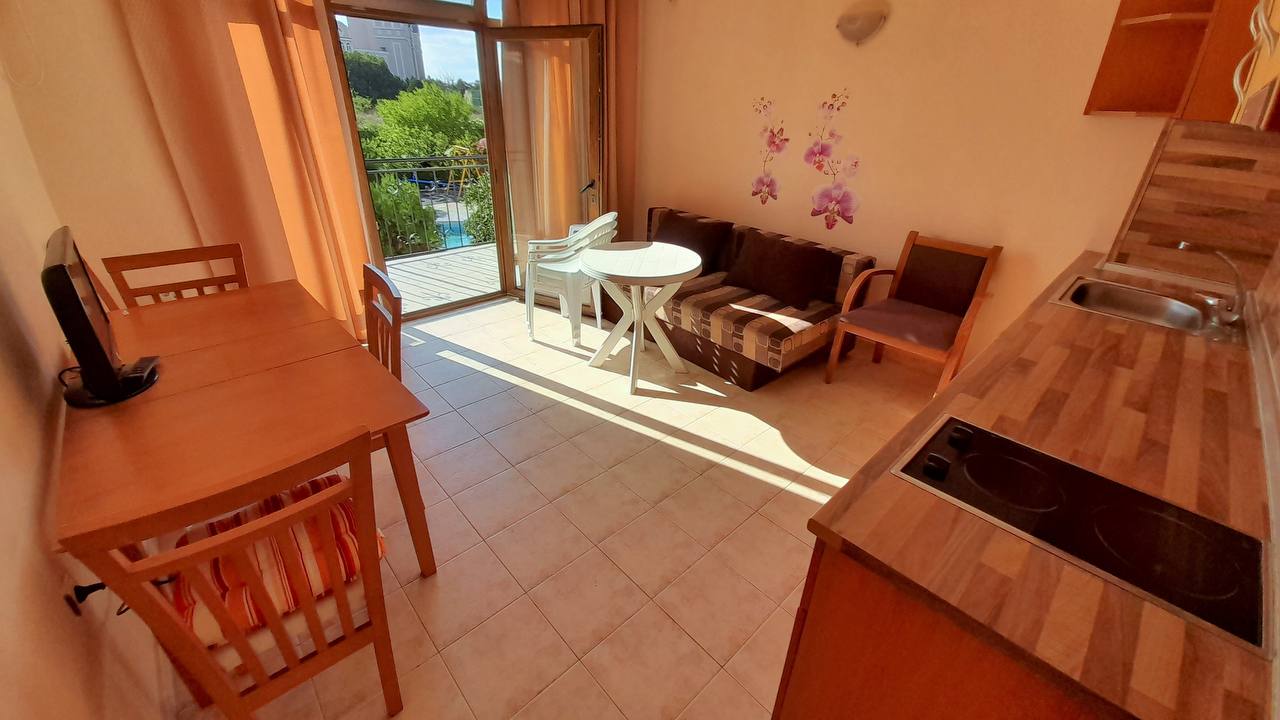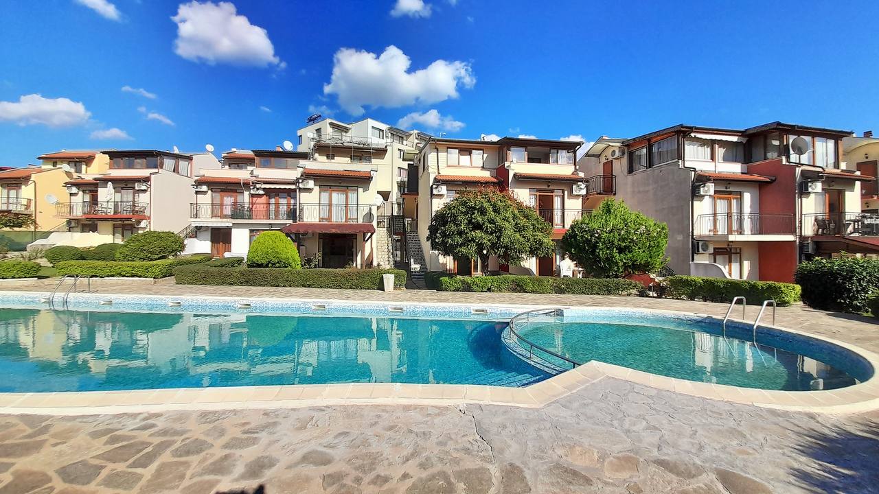 Предлагается к продаже современная двухкомнатная вилла площадью 65 м², расположенная на втором этаже в одном из самых привлекательных районов курорта Святой Влас. Дом находится всего в 100 метрах от моря и предлагает великолепный вид на море и бассейн. Стоимость — 96 000 евро, с возможностью покупки в рассрочку. Годовая такса обслуживания составляет 630 евро.